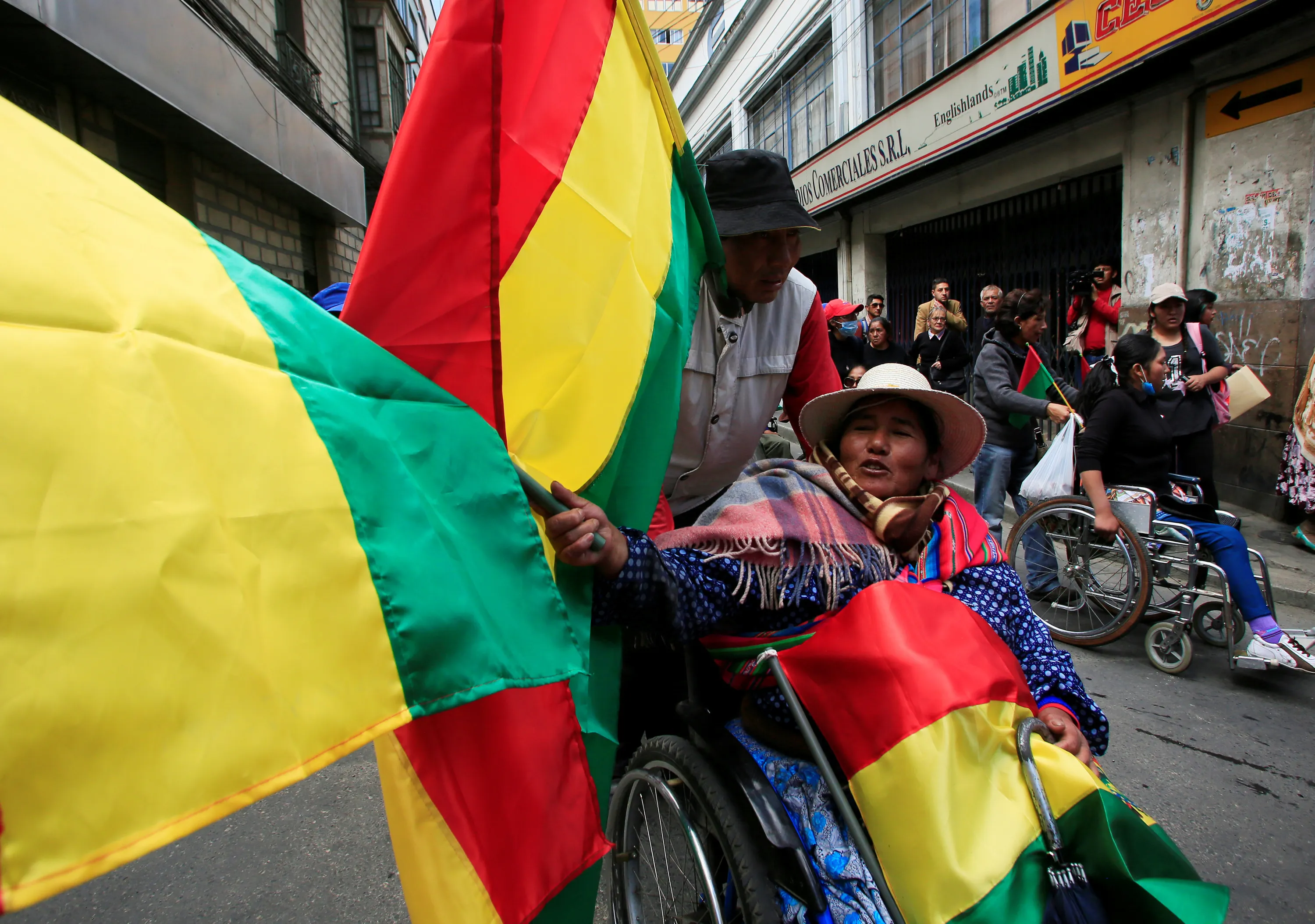 A demonstrator with physical disabilities, holding Bolivia's national flags, participates in a rally protest calling on the government to increase their monthly disability subsidy, in La Paz, Bolivia, May 5, 2016. (Photo by David Mercado/Reuters)