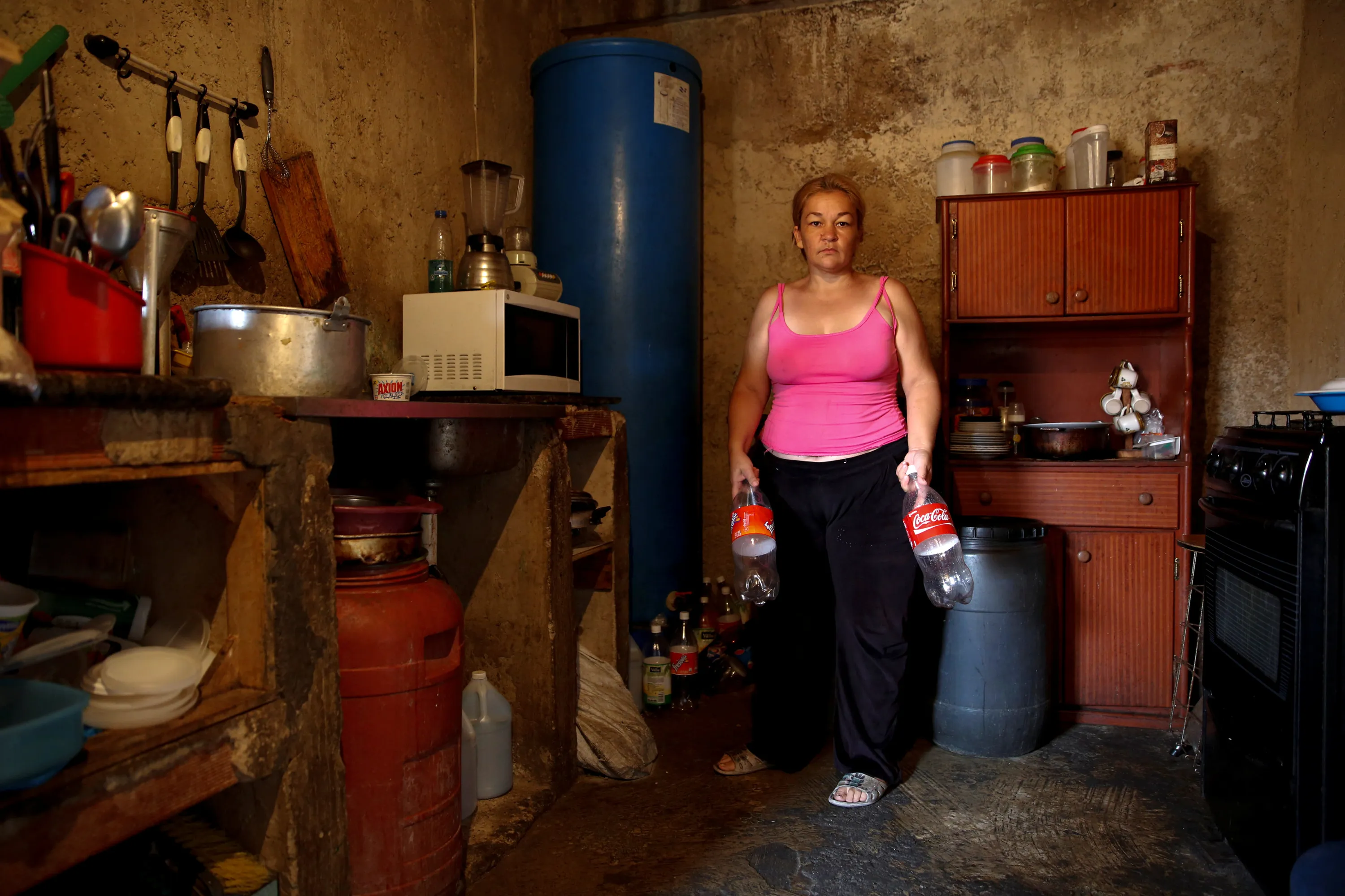 Yunni Perez holds plastic bottles used to carry water while she poses for a picture in her house, in a neighbourhood called “The Tank” at the slum of Petare in Caracas, Venezuela, April 3, 2016. (Photo by Carlos Garcia Rawlins/Reuters)