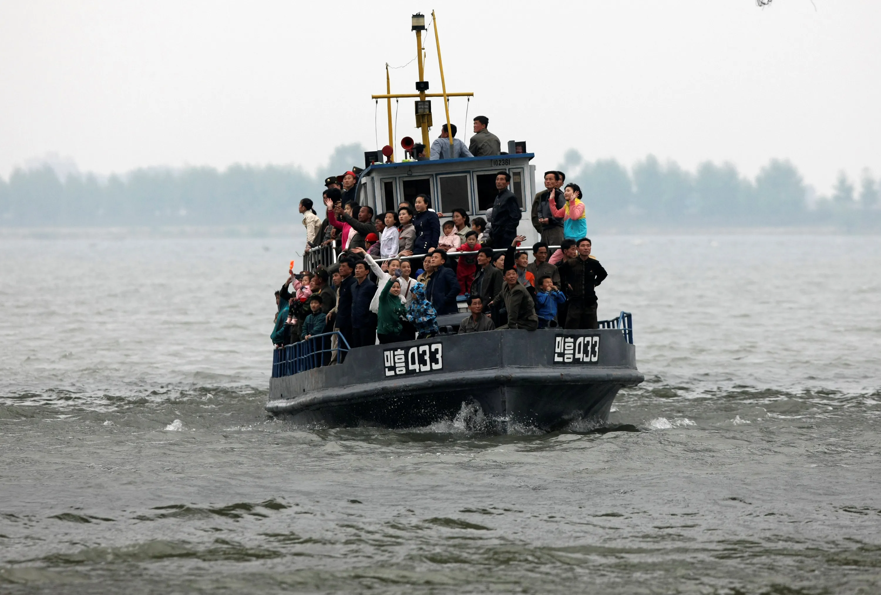 North Korean tourists wave during their tour on the Yalu River in Sinuiju, near the Chinese border city of Dandong, May 1, 2016. Picture taken from China's side of the Yalu. (Photo by Jacky Chen/Reuters)