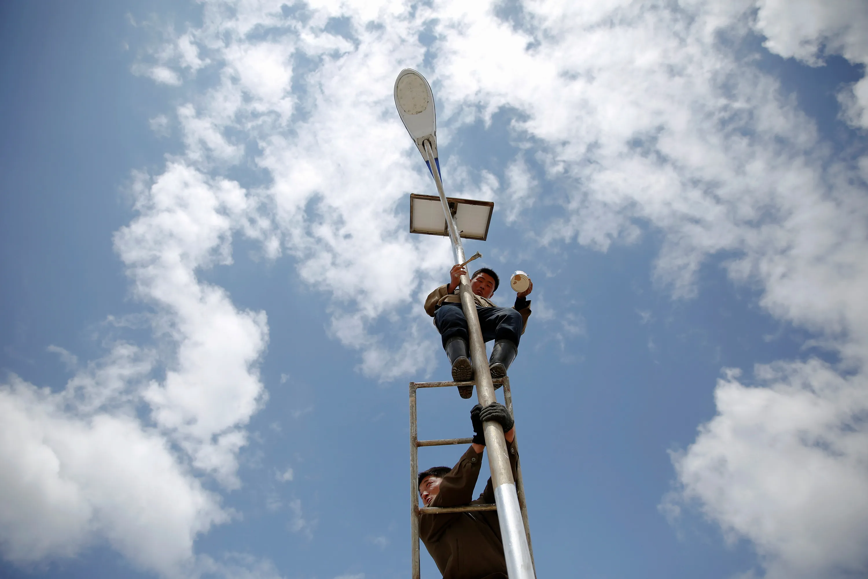 A man paints a solar street lamp in suburbs of Pyongyang, North Korea May 4, 2016. (Photo by Damir Sagolj/Reuters)
