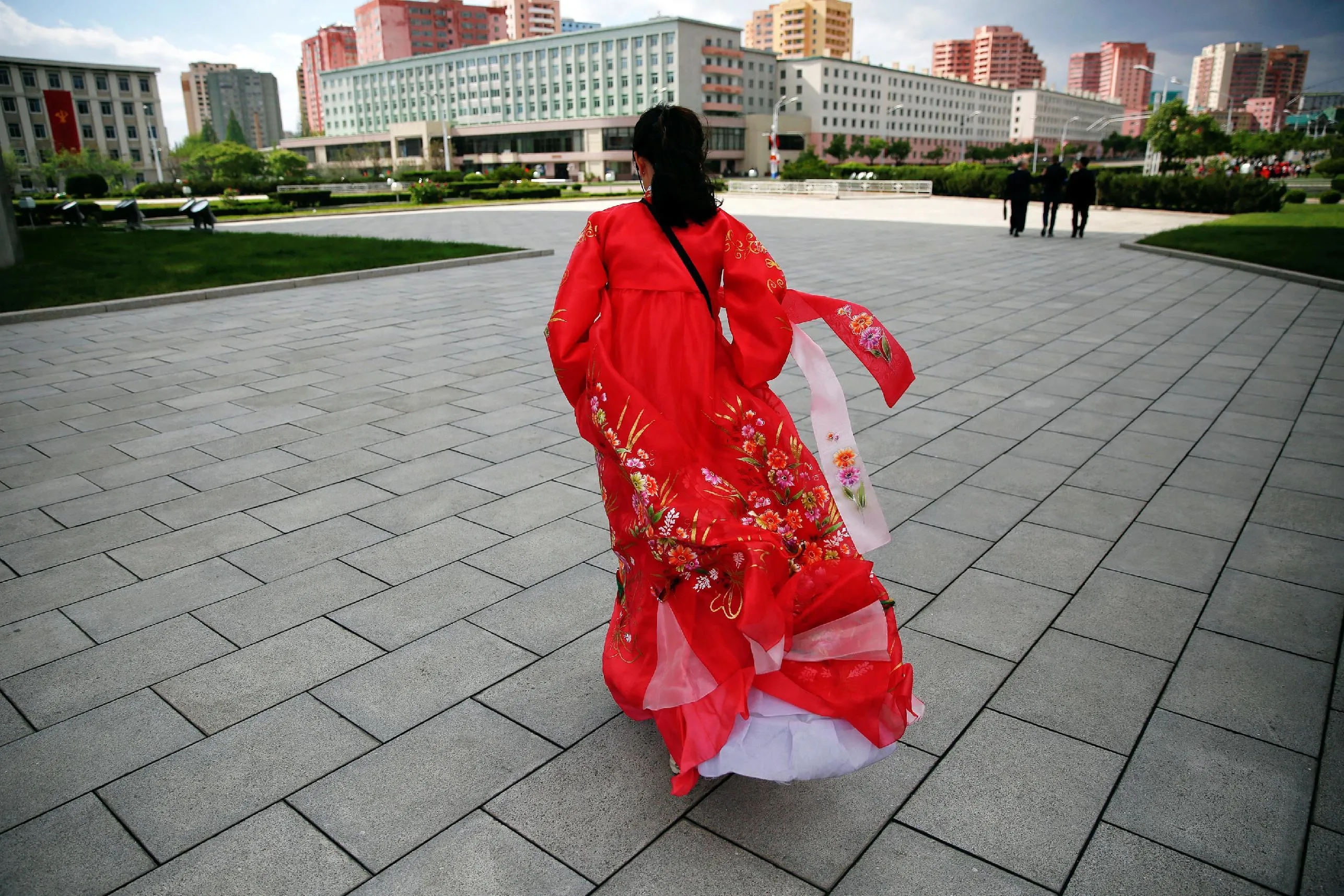 A guide wearing a traditional dress walks in front of visitors at the Arch of Triumph in Pyongyang, North Korea May 4, 2016. (Photo by Damir Sagolj/Reuters)