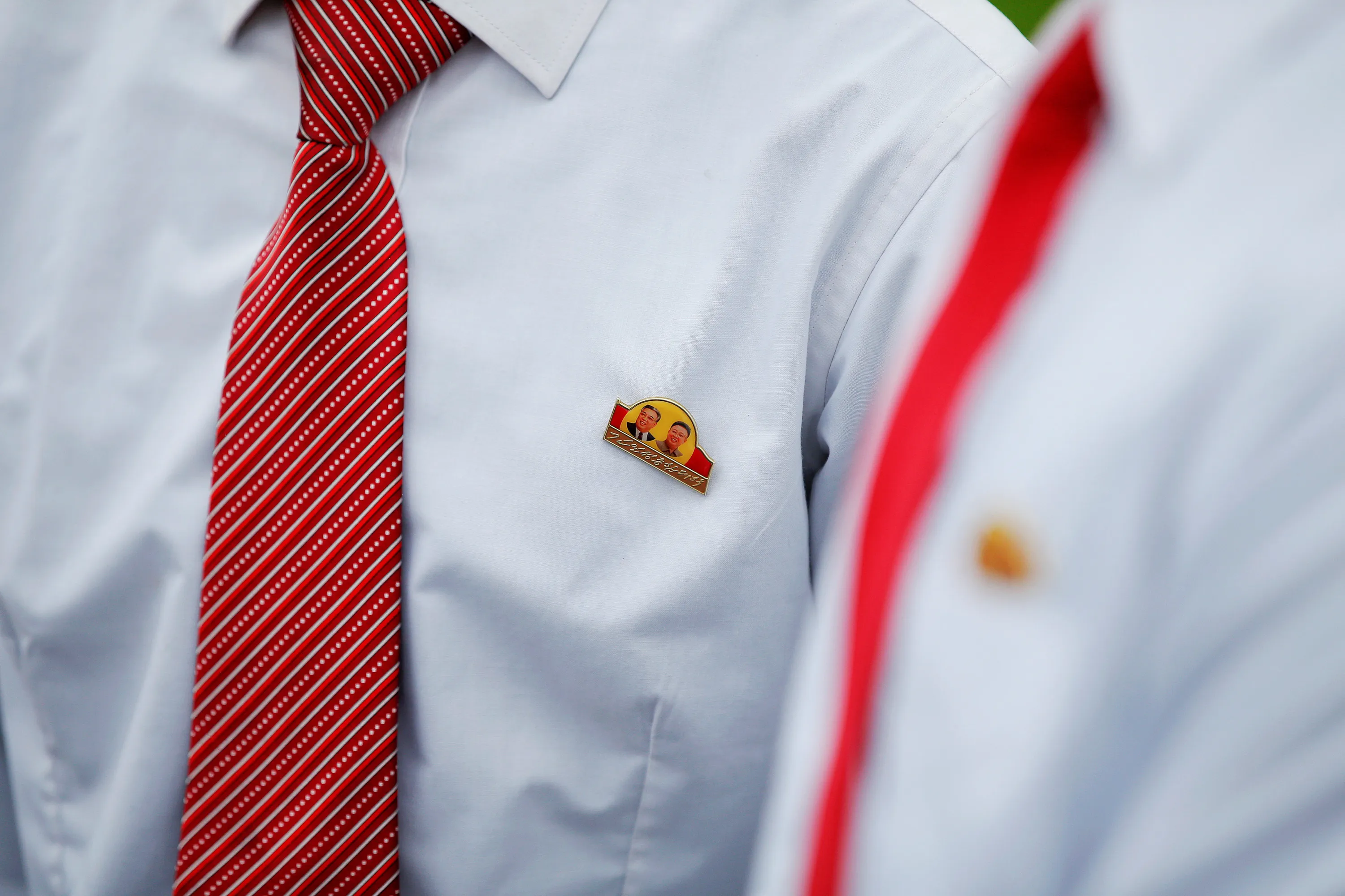 Schoolchildren wear badges with pictures of former North Korean leaders Kim Il Sung and Kim Jong Il near April 25 House of Culture, the venue of Workers' Party of Korea (WPK) congress in Pyongyang, North Korea May 6, 2016. (Photo by Damir Sagolj/Reuters)