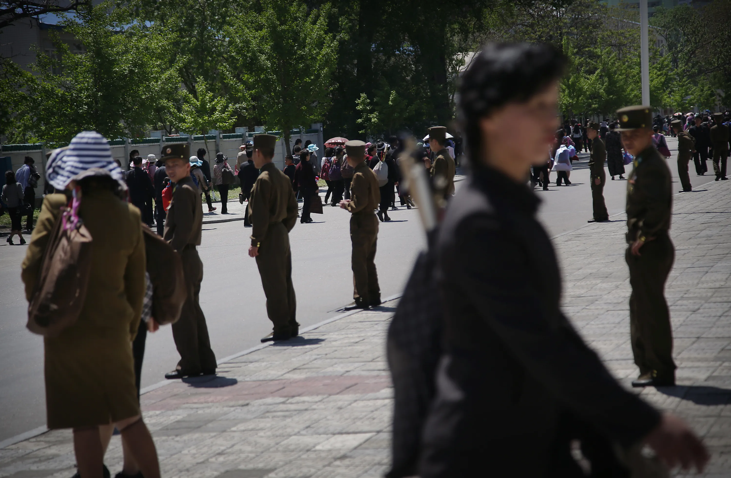 North Korean soldiers stand by a sidewalk while people carrying decorative flowers make their way from the Kim Il Sung Square Sunday, May 8, 2016, in Pyongyang, North Korea. (Photo by Wong Maye-E/AP Photo)