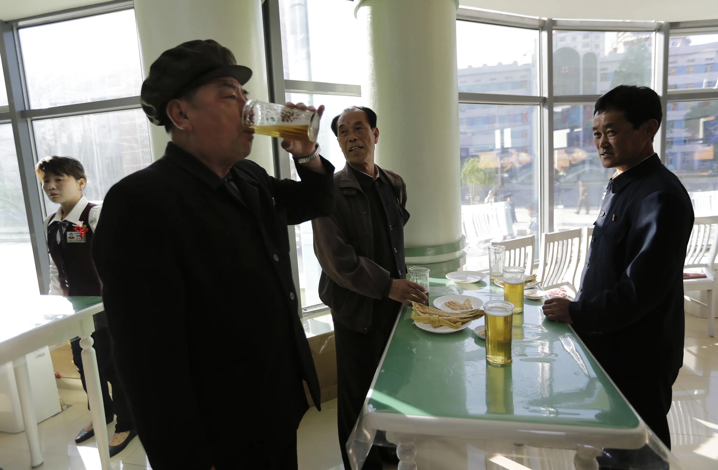 In this Saturday, May 7, 2016, photo, Pak Sun Won, 66, left, a retired physician drinks a glass of draft beer at the Taedonggang Beer shop with his friends in Pyongyang, North Korea. (Photo by Wong Maye-E/AP Photo)