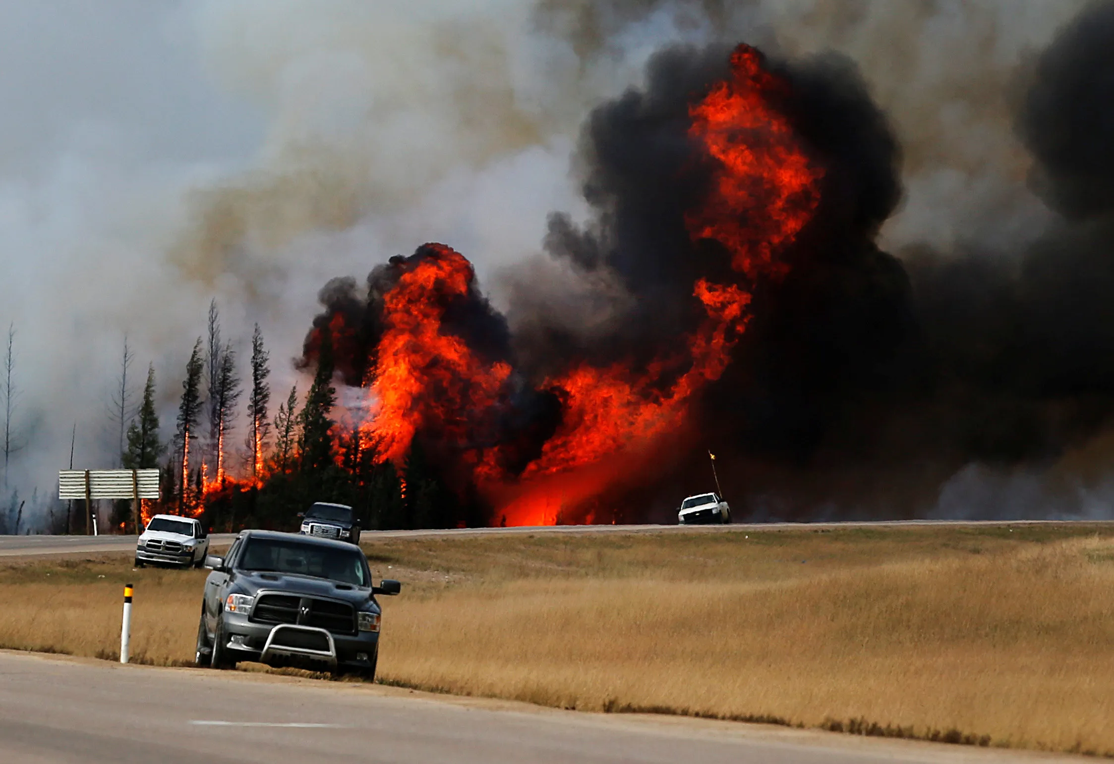 Smoke and flames from the wildfires erupt behind cars on the highway near Fort McMurray, Alberta, Canada, May 7, 2016. (Photo by Mark Blinch/Reuters)