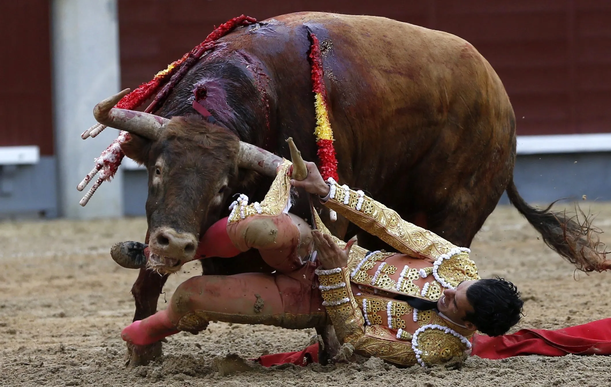 Spanish bullfighter Morenito de Aranda is gored by his first bull of the evening during the bullfighting event held on occasion of San Isidro Fest at Las Ventas bullring in Madrid, Spain, 08 May 2016. (Photo by Javier Lizon/EPA)