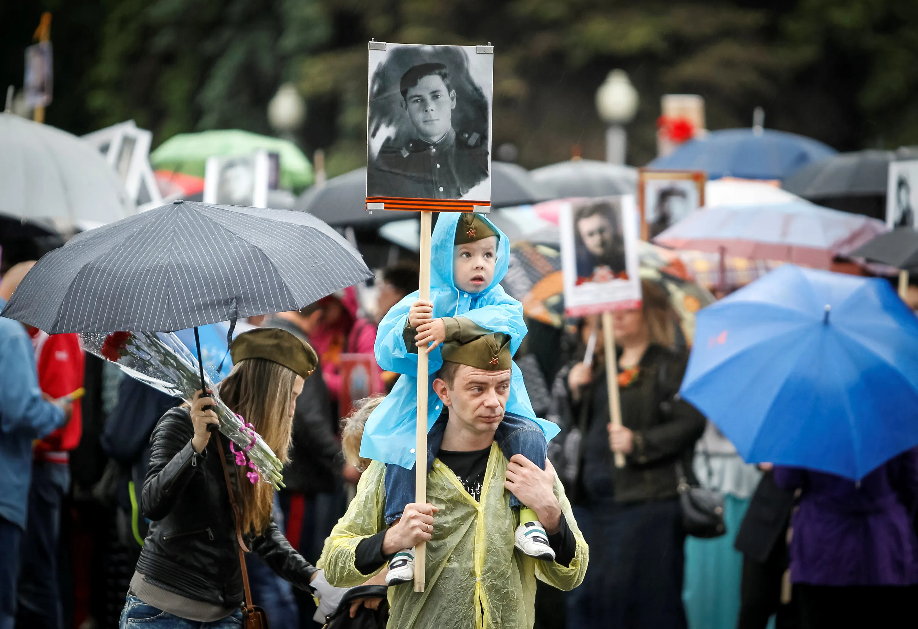 A man with his child hold a portrait of their deceased relative who took part in World War Two during a march at Victory Day commemorations in Almaty, Kazakhstan, May 9, 2016. (Photo by Shamil Zhumatov/Reuters)