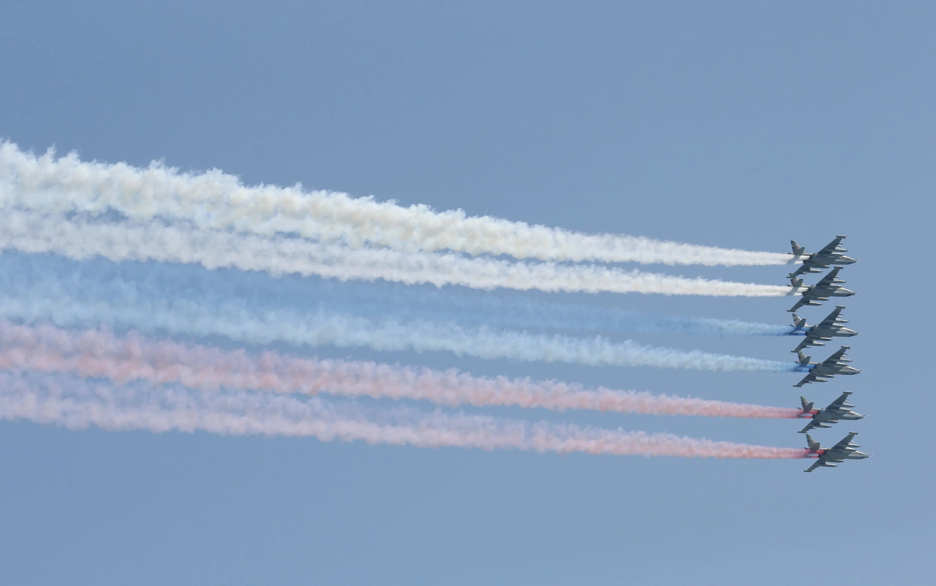 Russian Su-25 jet fighters release smoke in the colours of the Russian flag during the Victory Day parade, marking the 71st anniversary of the victory over Nazi Germany in World War Two, above Red Square in Moscow, Russia, May 9, 2016. (Photo by Grigory Dukor/Reuters)
