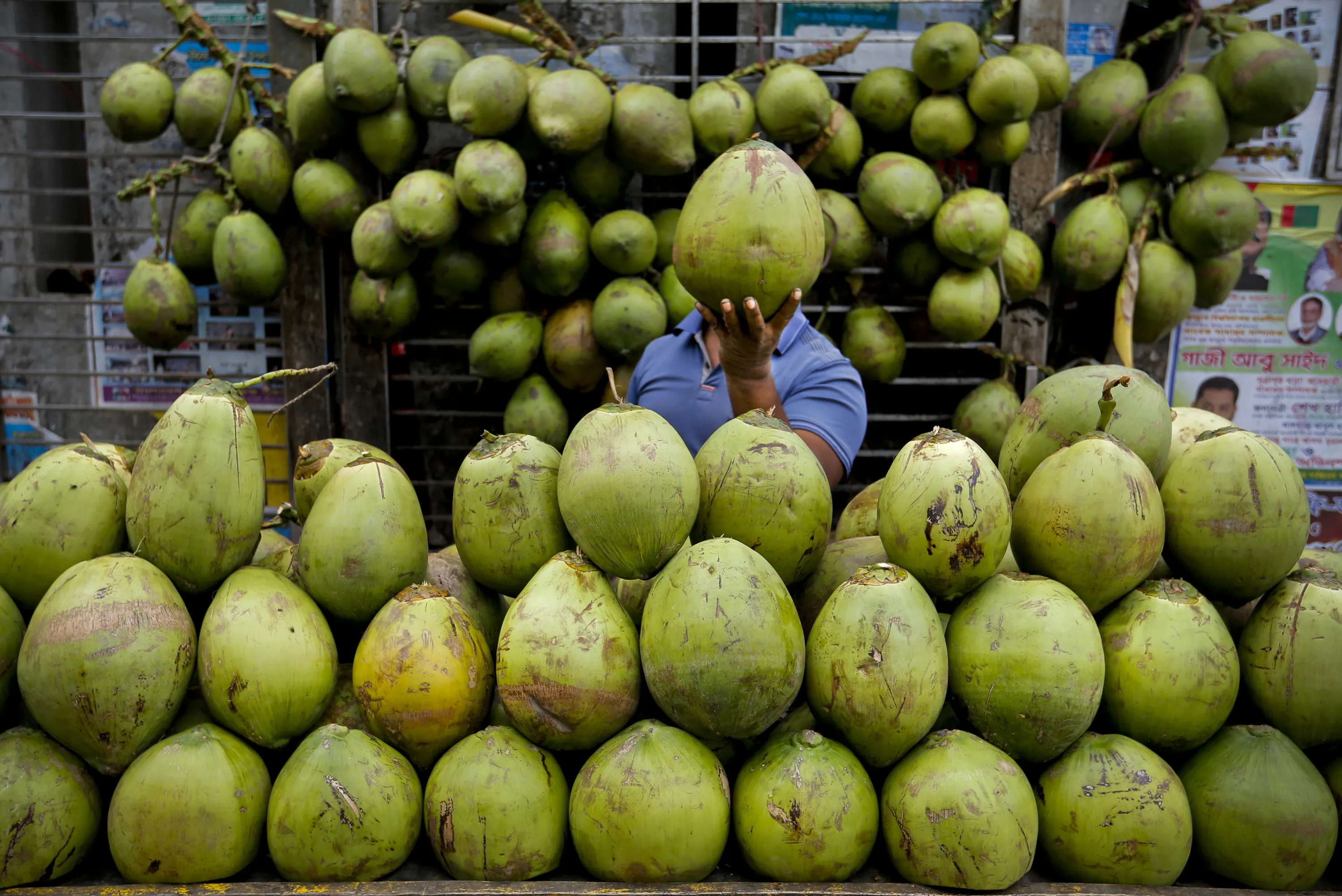 A Bangladeshi street vendor sells coconut on a street in Dhaka, Bangladesh, Wednesday, May 4, 2016. Many Bangladeshi people drink coconut water in summer to beat the heat. (Photo by A.M. Ahad/AP Photo)