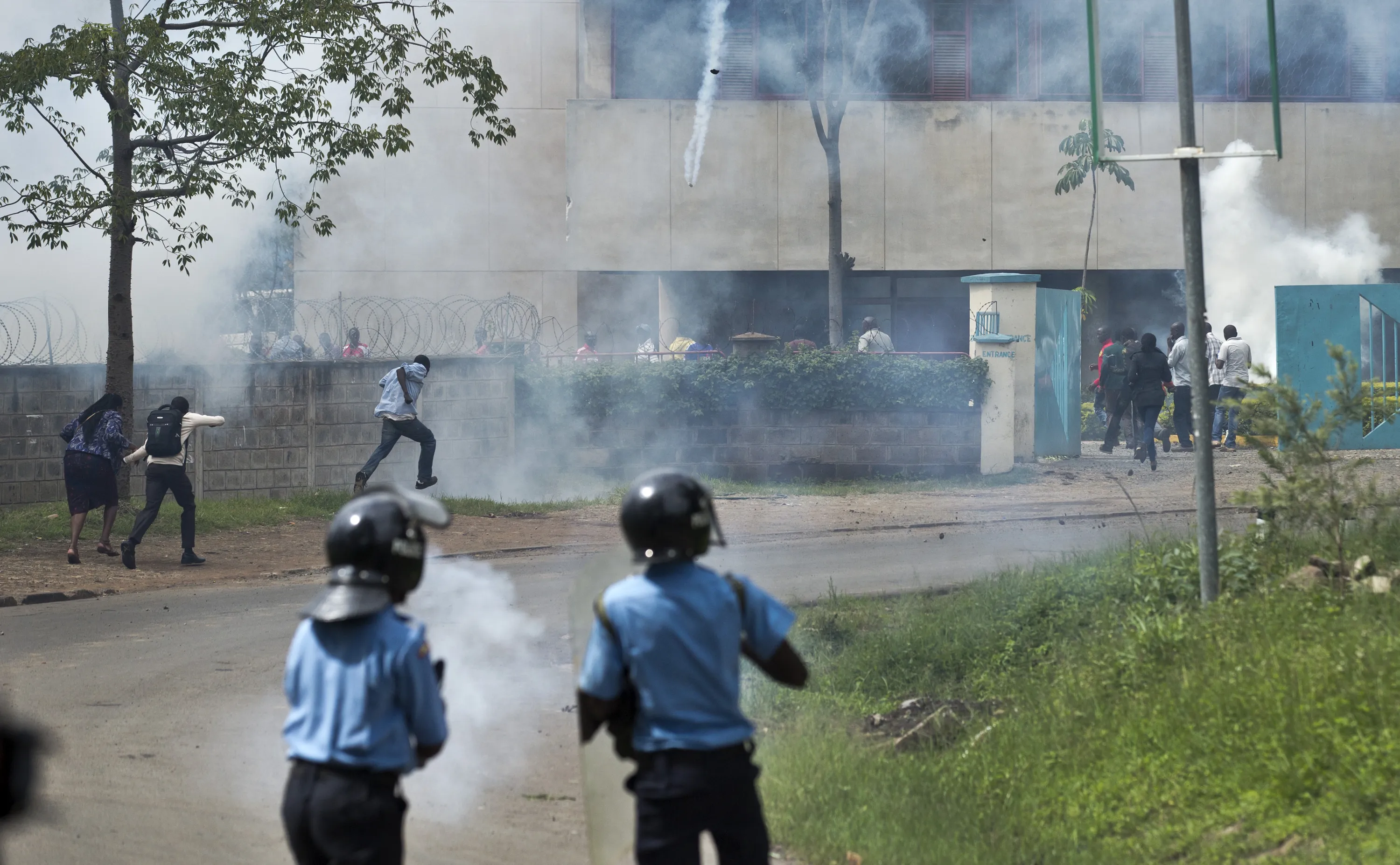 Police fire tear gas towards opposition supporters as they run away during a protest in downtown Nairobi, Kenya Monday, May 9, 2016. (Photo by Ben Curtis/AP Photo)