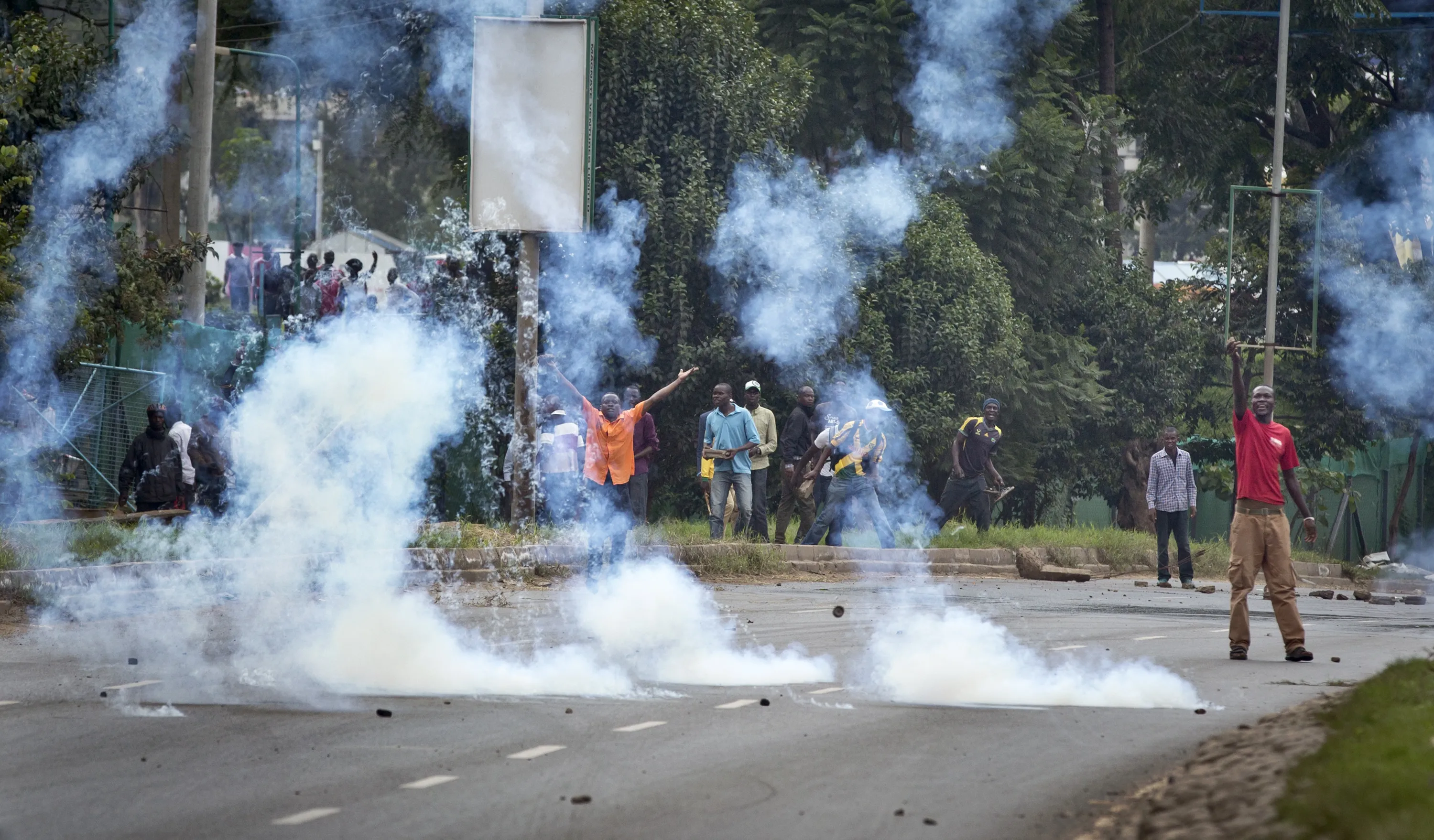 Tear gas canisters rain down next to opposition supporters as they taunt riot police during a protest in downtown Nairobi, Kenya Monday, May 9, 2016. (Photo by Ben Curtis/AP Photo)