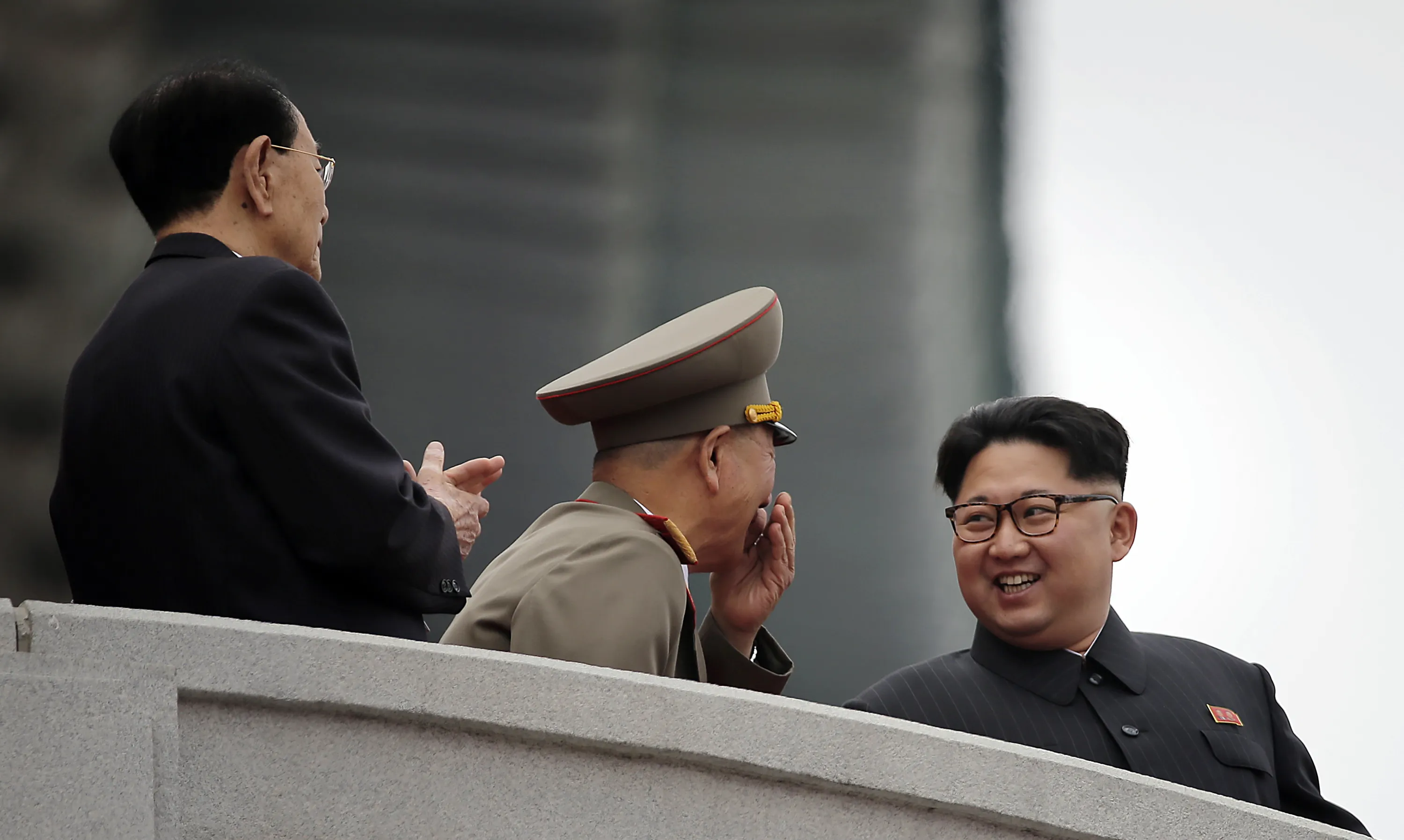North Korean leader Kim Jong Un, right, smiles at Hwang Pyong So, the top political officer of the Korean People's Army, center, and Kim Yong Nam, the head of North Korea's parliament, left, as they watch parade participants at the Kim Il Sung Square on Tuesday, May 10, 2016, in Pyongyang, North Korea. (Photo by Wong Maye-E/AP Photo)
