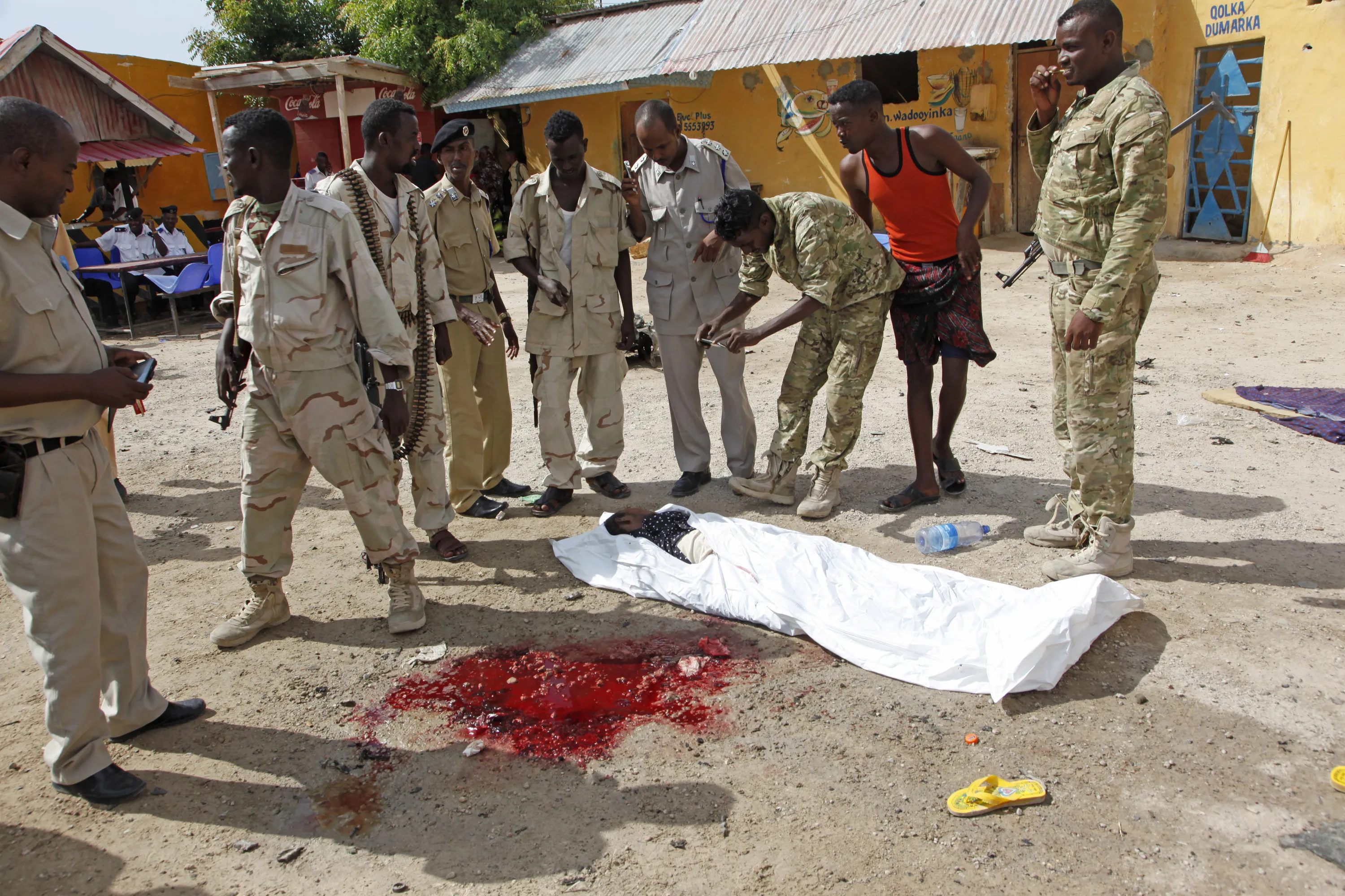 Somali police officers stand around the body of a suspected al-Shabab extremist in Mogadishu, Somalia, Monday, May, 9, 2016. A Somali police official says a suicide car bomber struck the entrance of the East African country's traffic police headquarters in the capital, killing four people and injuring others. Somalia's Islamic extremist rebels, al-Shabab, claimed responsibility for the attack, which shattered a period of calm in the seaside city. (Photo by Farah Abdi Warsameh/AP Photo)