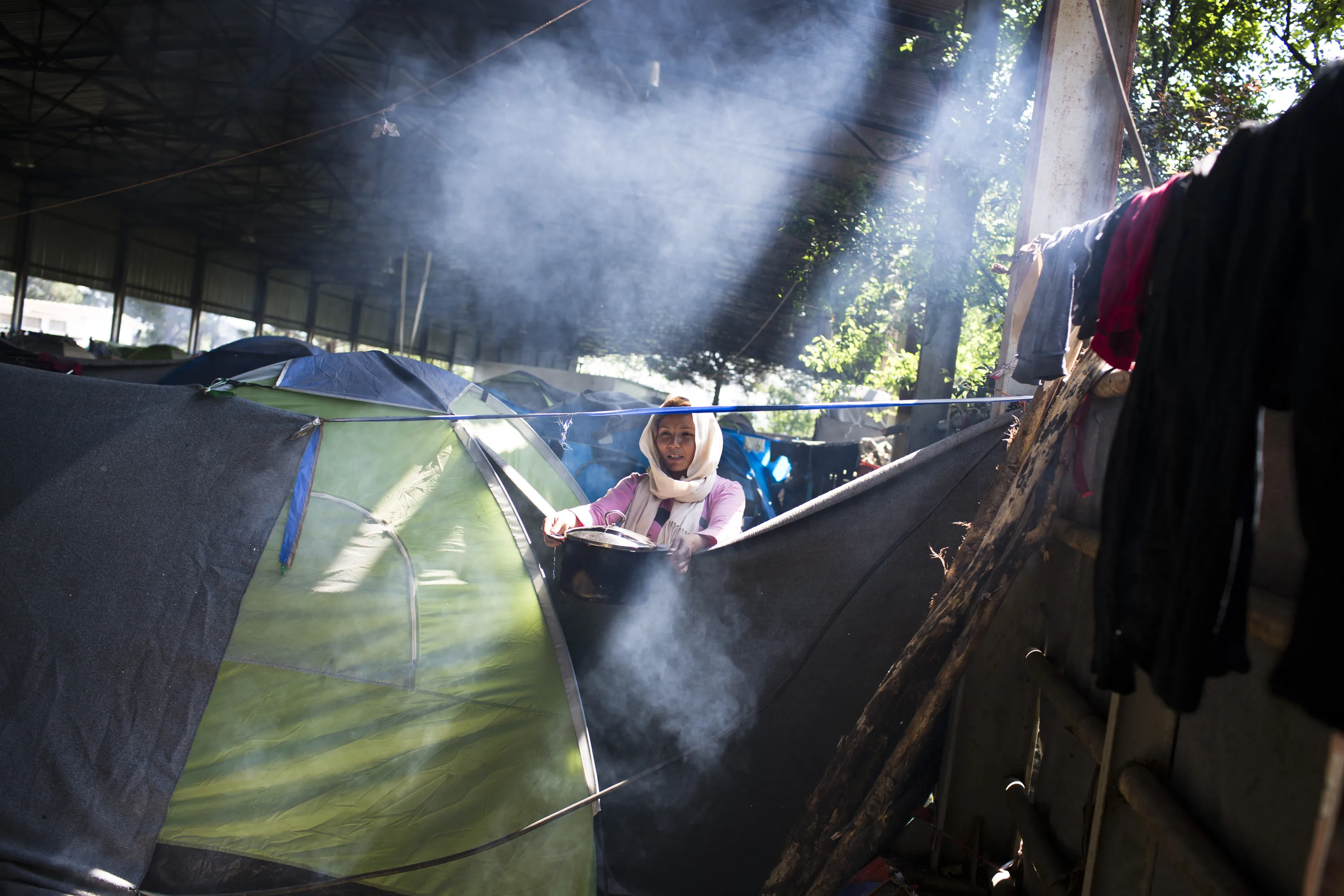 A woman hold a cooking pot as she prepares food near a makeshift fire in a railway repairs shed where people have set up their tents at the northern Greek border point of Idomeni, Greece, on Monday, May 9, 2016. About 54,000 refugees and migrants are currently stranded in Greece as 10,000 are camped in Idomeni, after the European Union and Turkey reached a deal designed to stem the flow of refugees into Europe�s prosperous heartland. (Photo by Petros Giannakouris/AP Photo)