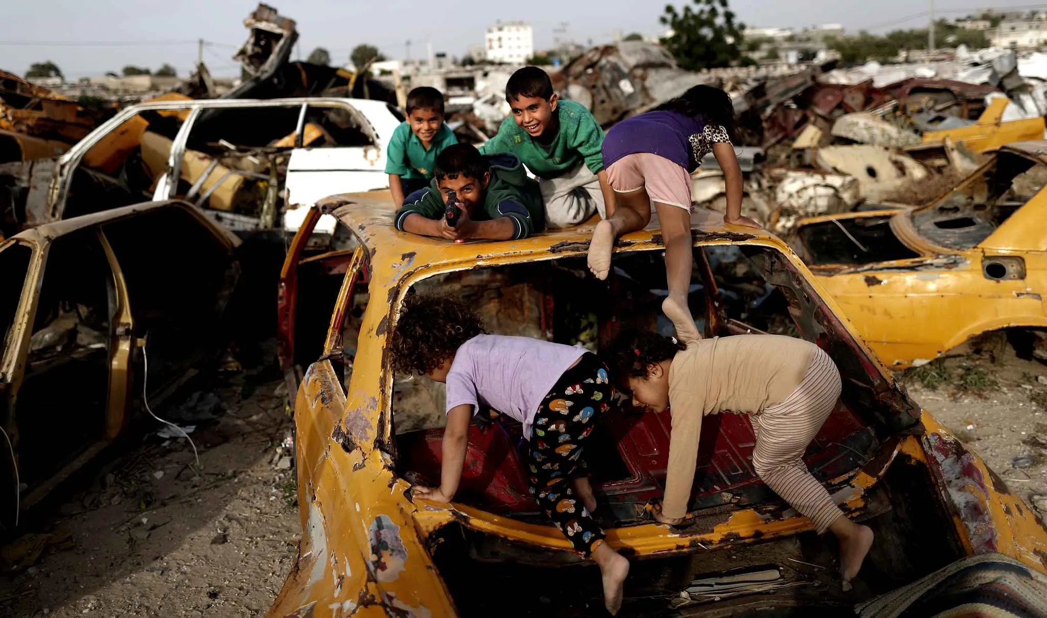 Palestinian children play amidst wrecked cars in an impoverished area in the southern Gaza Strip city of Khan Yunis, on May 9, 2016. (Photo by Thomas Coex/AFP Photo)