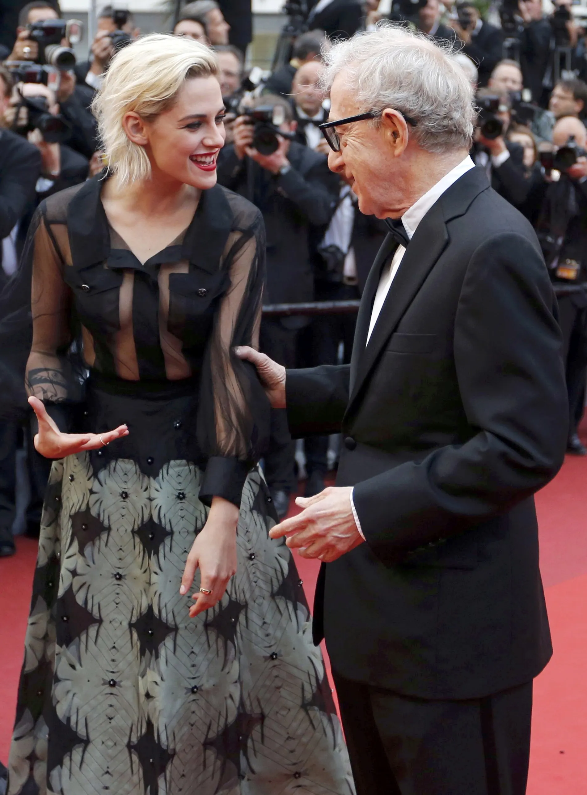 Director Woody Allen jokes with cast member Kristen Stewart on the red carpet as they arrive for the opening ceremony and the screening of the film “Cafe Society” out of competition during the 69th Cannes Film Festival in Cannes, France, May 11, 2016. (Photo by Regis Duvignau/Reuters)