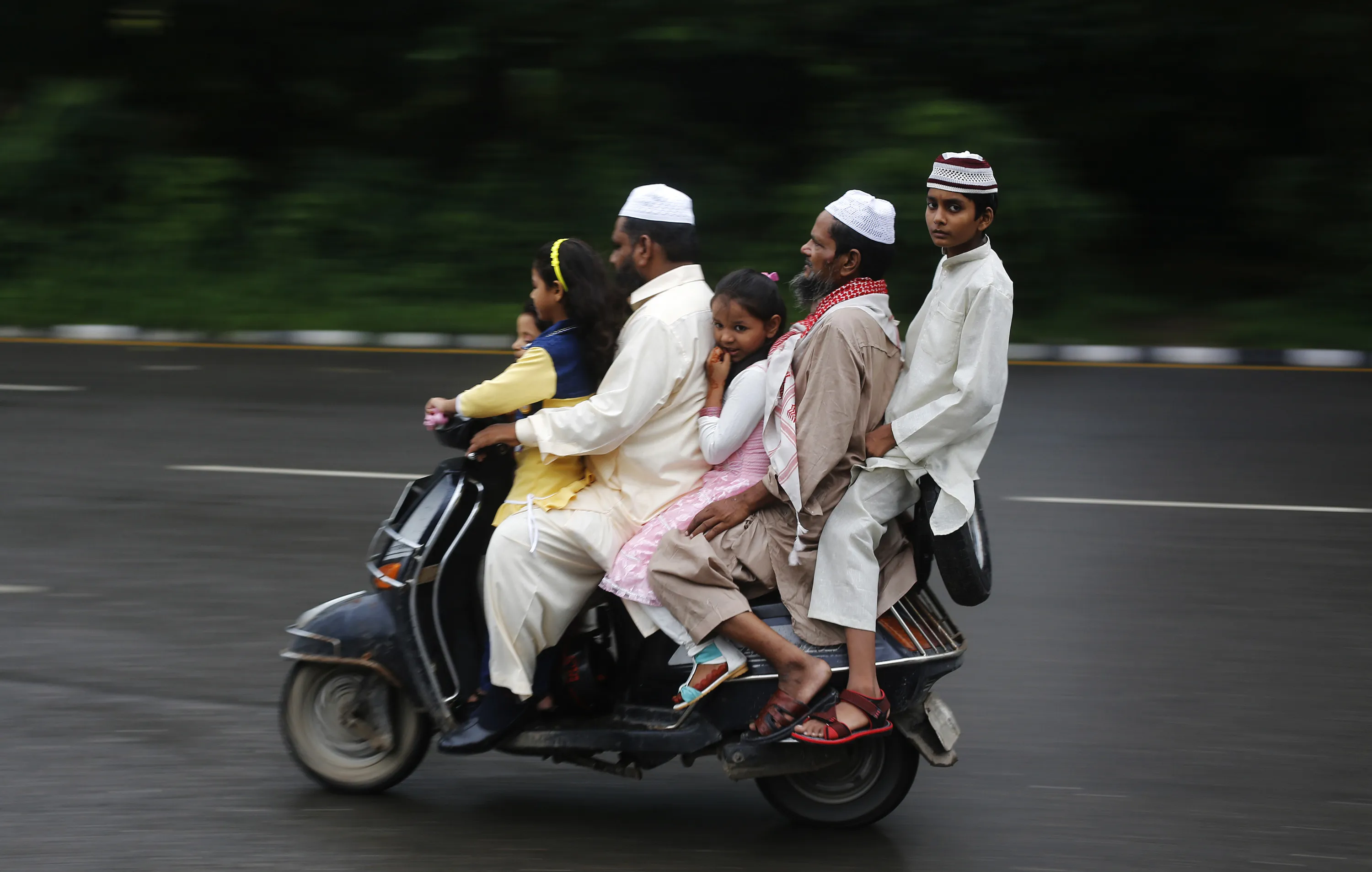 Muslims ride on a scooter on their way to offer prayers at the ruins of Feroz Shah Kotla mosque on the occasion of Eid al-Fitr in New Delhi August 9, 2013. (Photo by Adnan Abidi/Reuters)