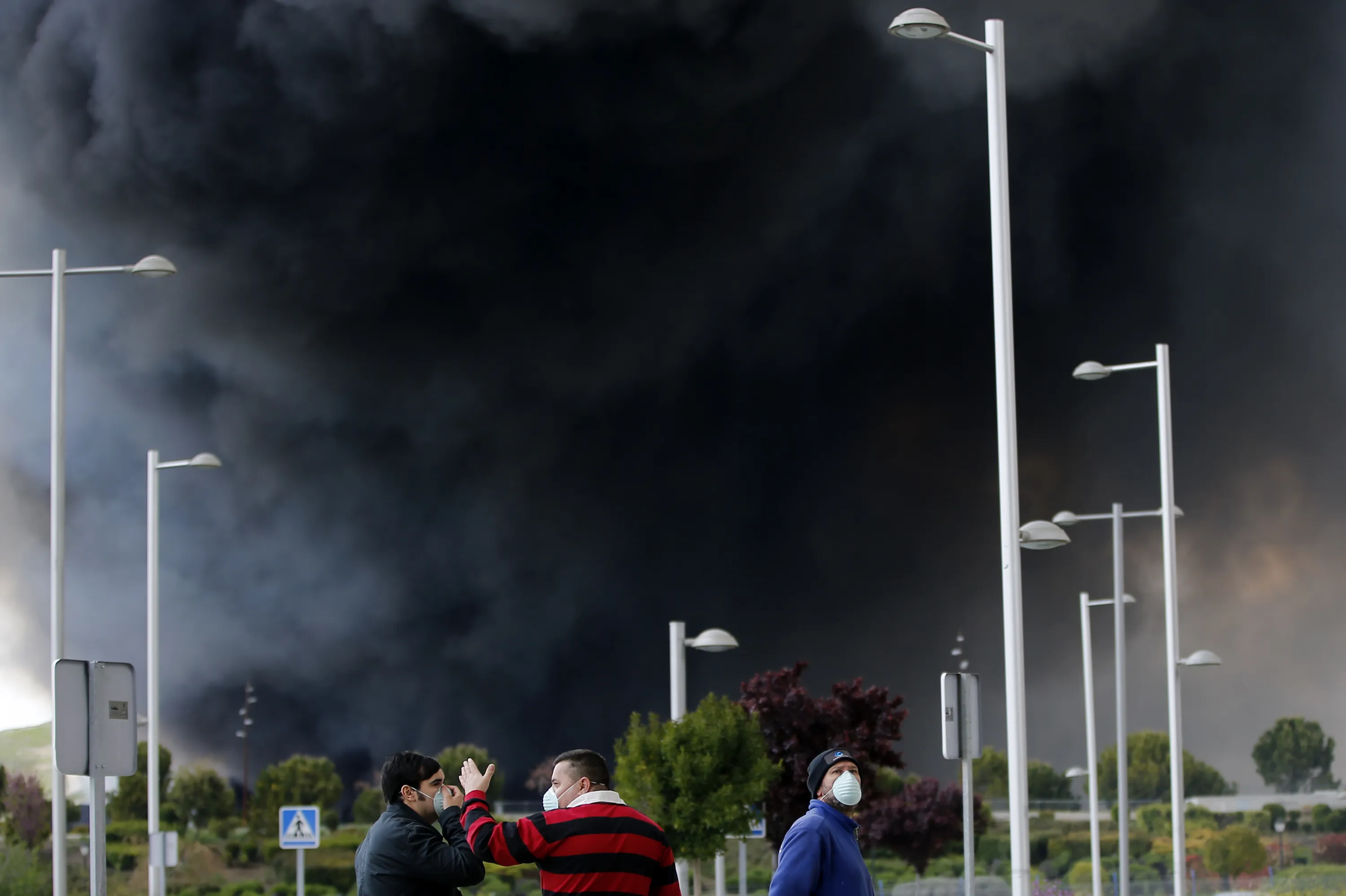Men with masks talk in front of billowing black smoke from a huge fire in Sesena, central Spain, Friday, May 13, 2016. (Photo by Paul White/AP Photo)