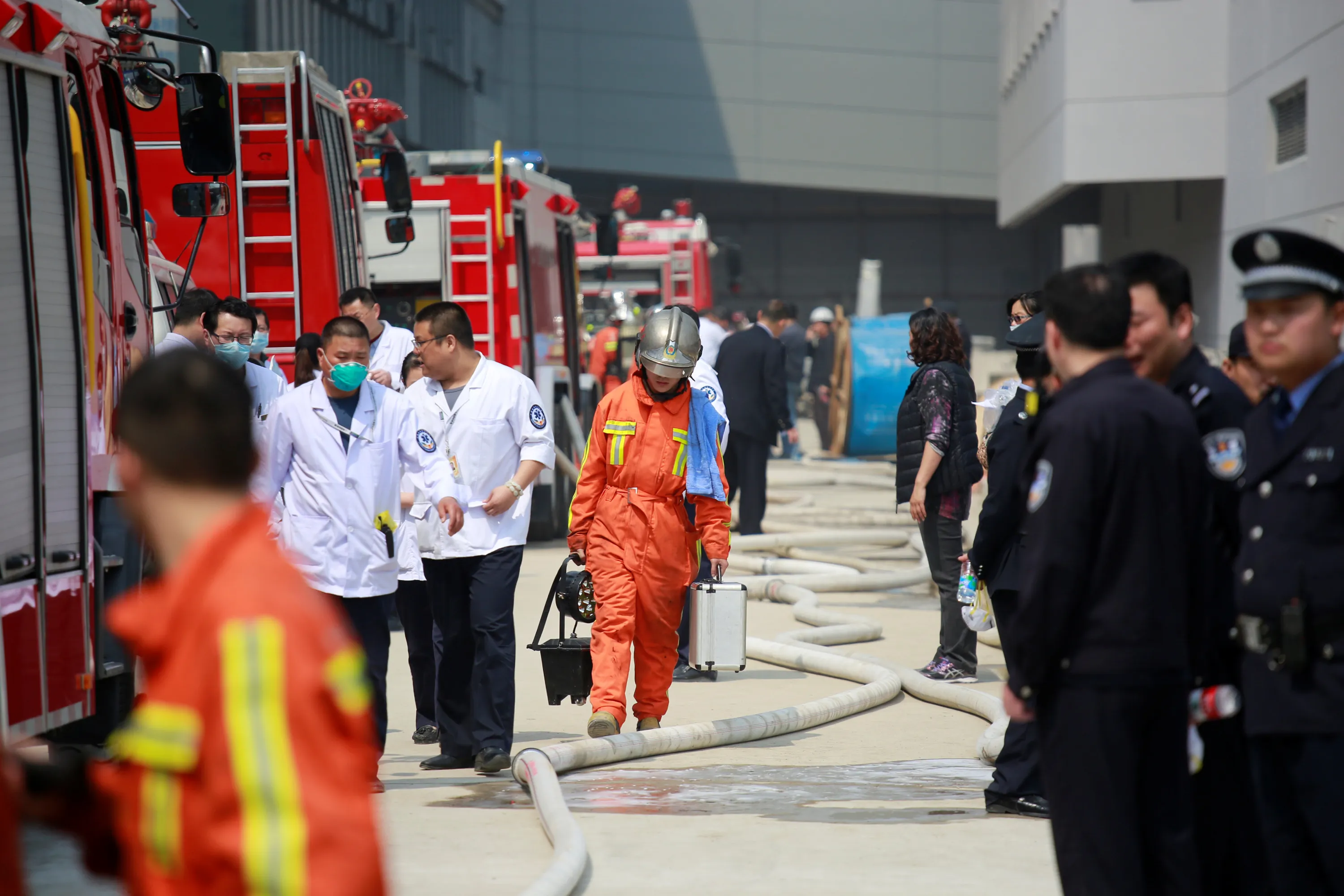 Firefighters and police are seen near the site of a fire at the Shanghai Hongqiao Airport in Shanghai April 29, 2016. (Photo by Reuters/China Daily)