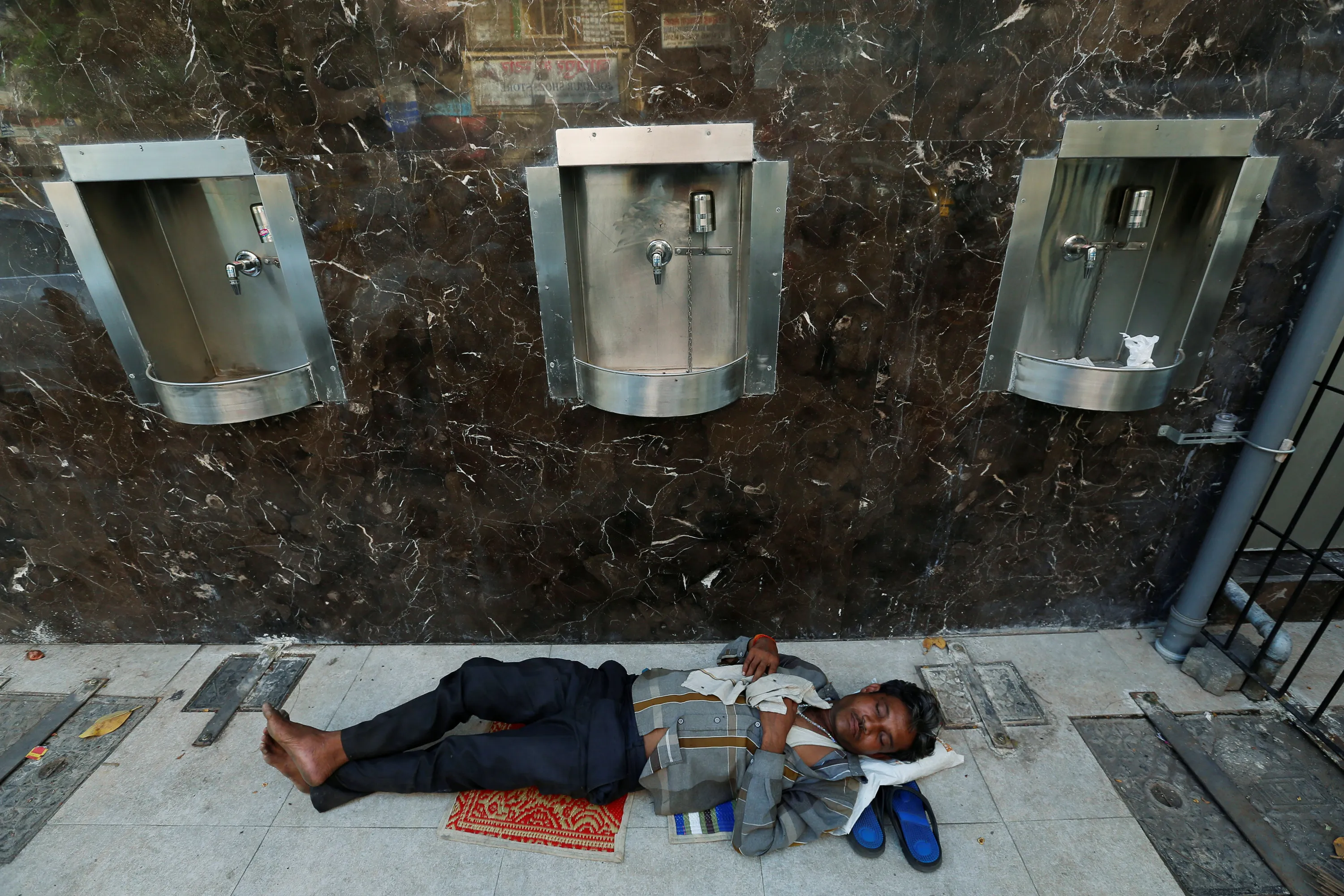 A man sleeps next to drinking water taps on a hot summer afternoon in Mumbai, India May 9, 2016. (Photo by Danish Siddiqui/Reuters)