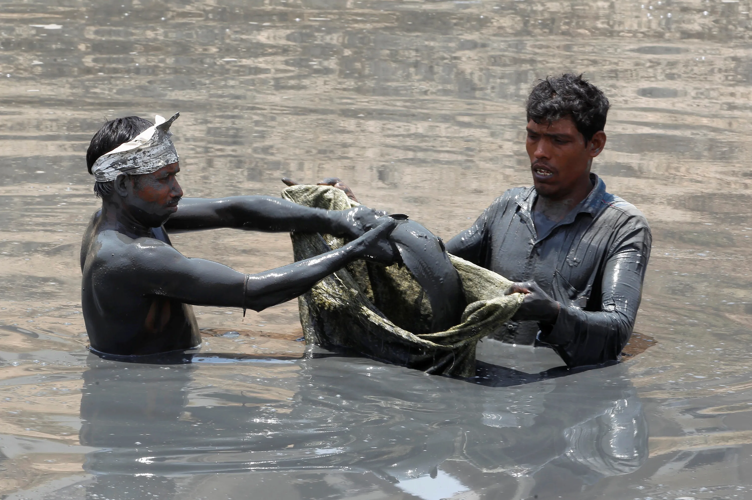 Municipal workers remove fish from the dried-up Ratanpura lake before moving them to the Sabarmati river, on the outskirts of Ahmedabad, India, May 10, 2016. (Photo by Amit Dave/Reuters)