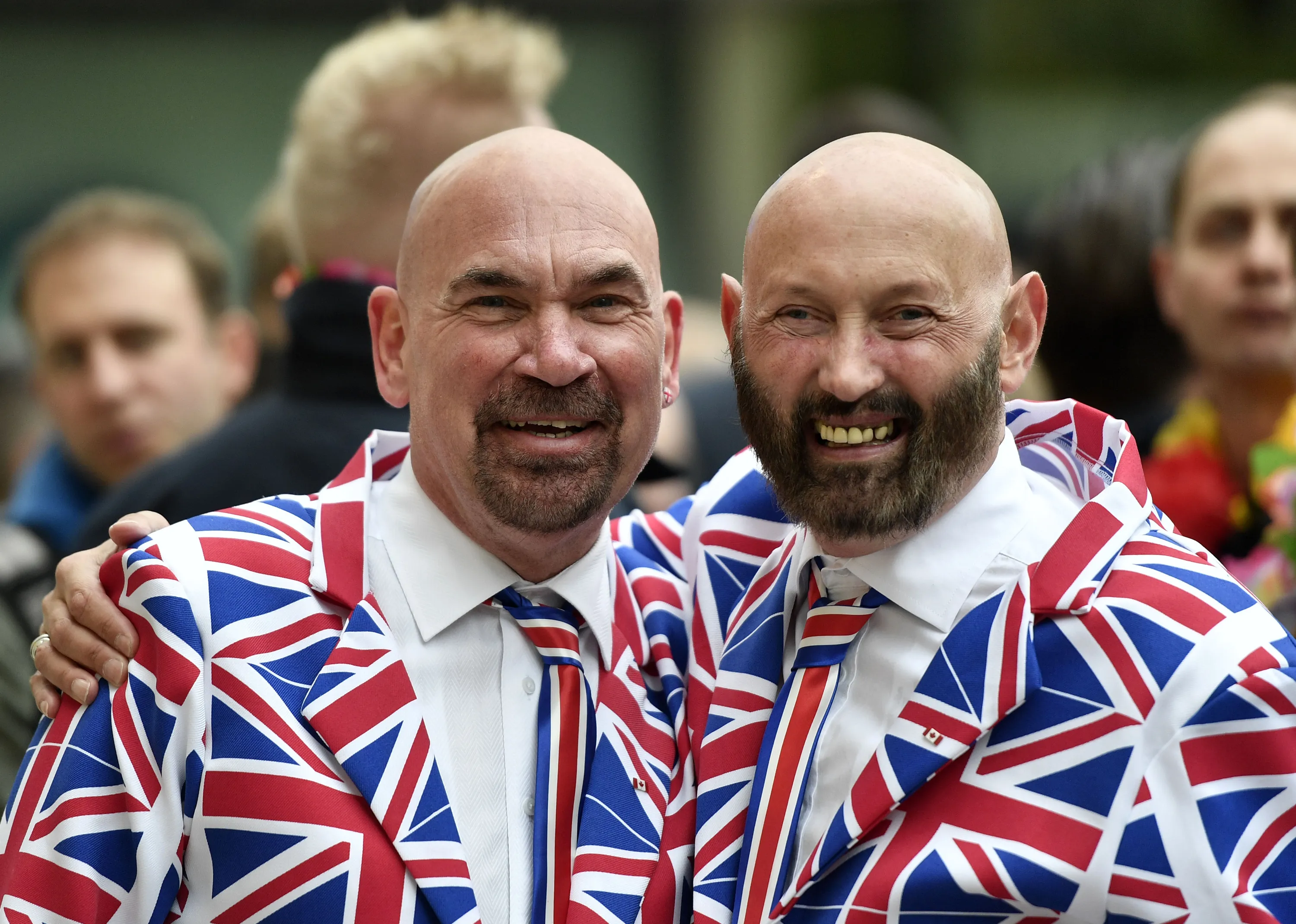 John and Gary from Manchester smile in front of the Globen Arena prior the first the Eurovision Song Contest final in Stockholm, Sweden, Saturday, May 14, 2016. (Photo by Martin Meissner/AP Photo)