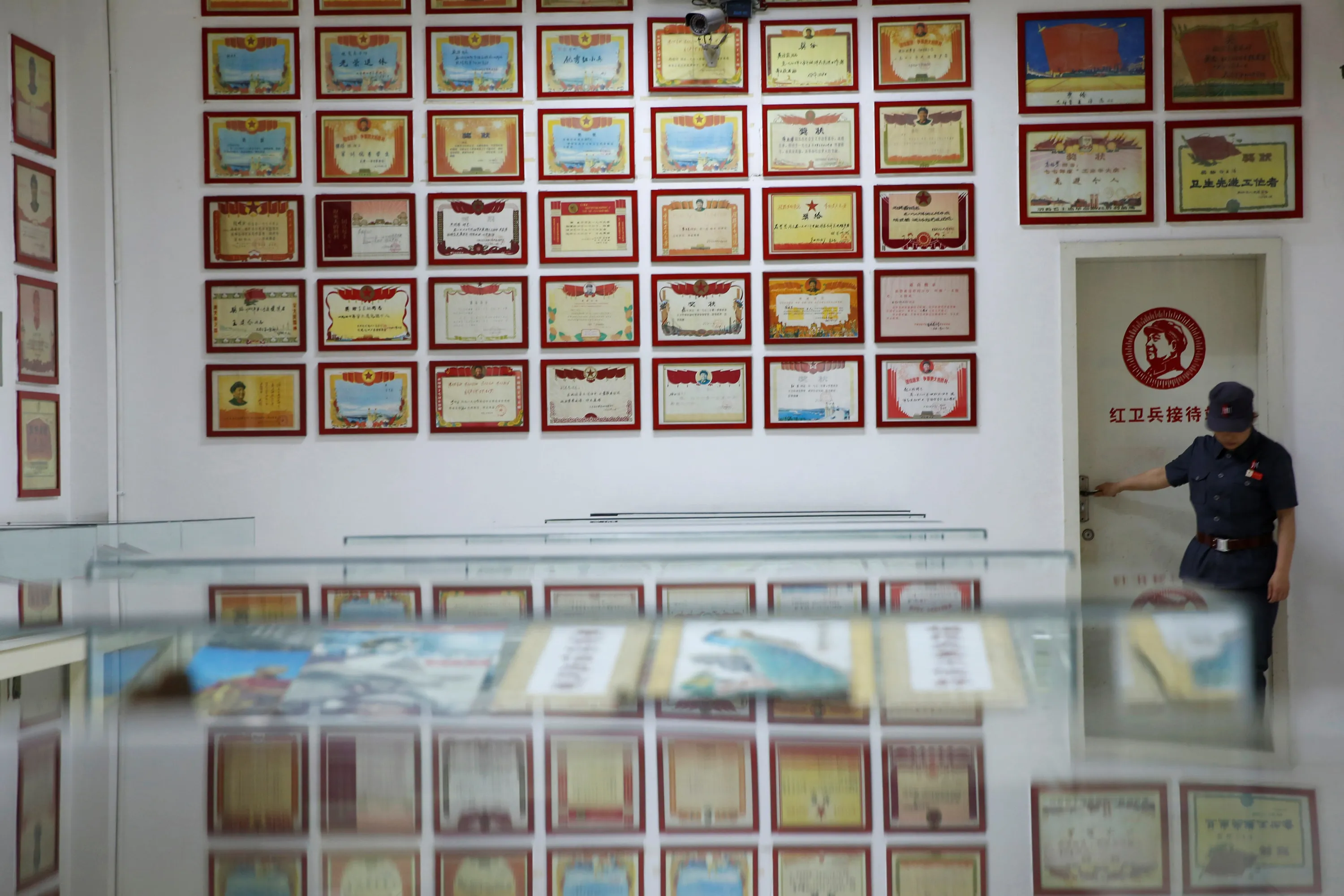 A staff member opens a door by a wall where honorary prize papers bearing the image of late Chinese Chairman Mao Zedong hang, at an exhibition hall at Jianchuan Museum Cluster in Anren, Sichuan Province, China, May 13, 2016. (Photo by Kim Kyung-Hoon/Reuters)
