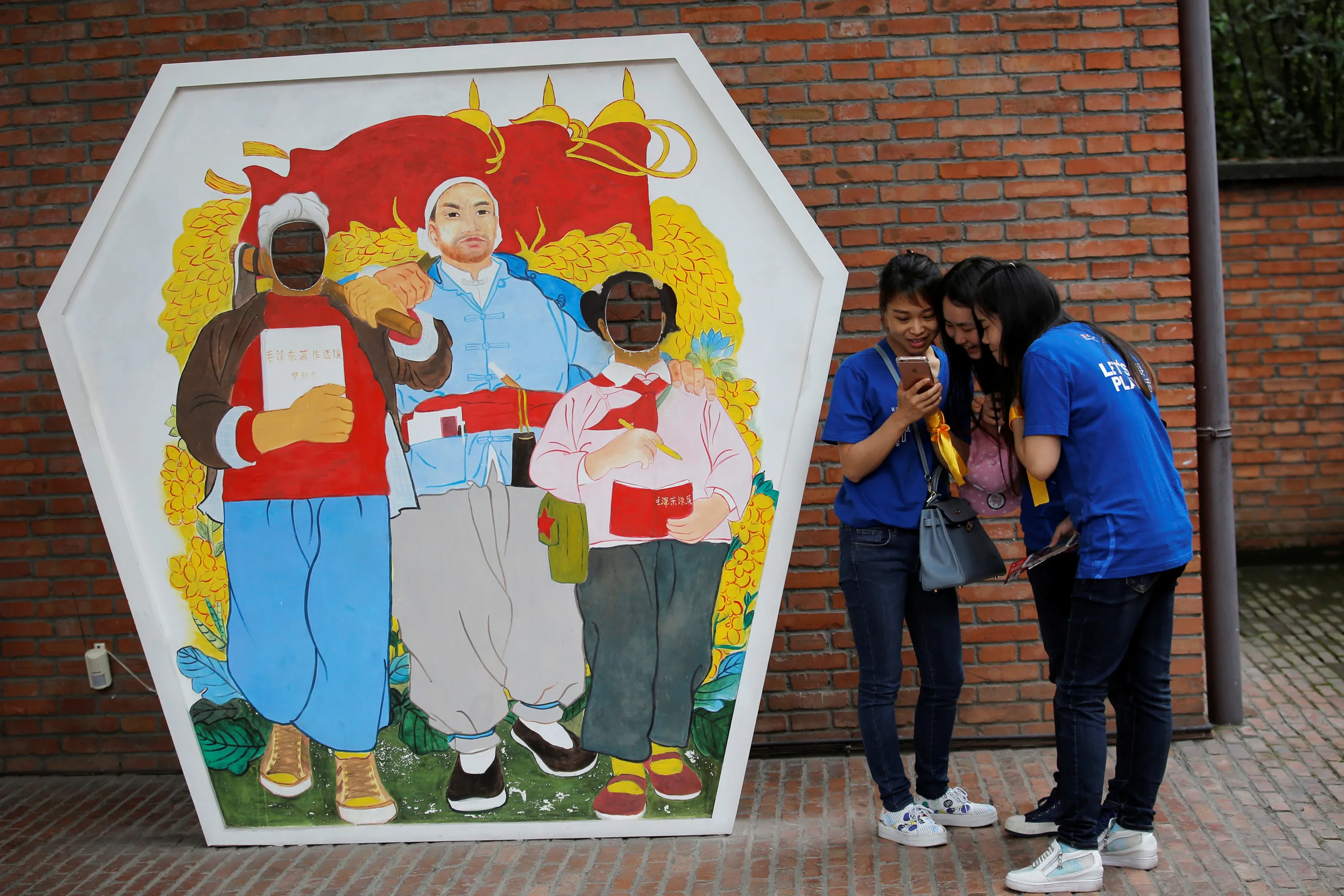 Visitors check their mobile phone after taking a picture with a cut-out depicting an image from a 1960-70s era poster at Jianchuan Museum Cluster in Anren, Sichuan Province, China, May 13, 2016. (Photo by Kim Kyung-Hoon/Reuters)