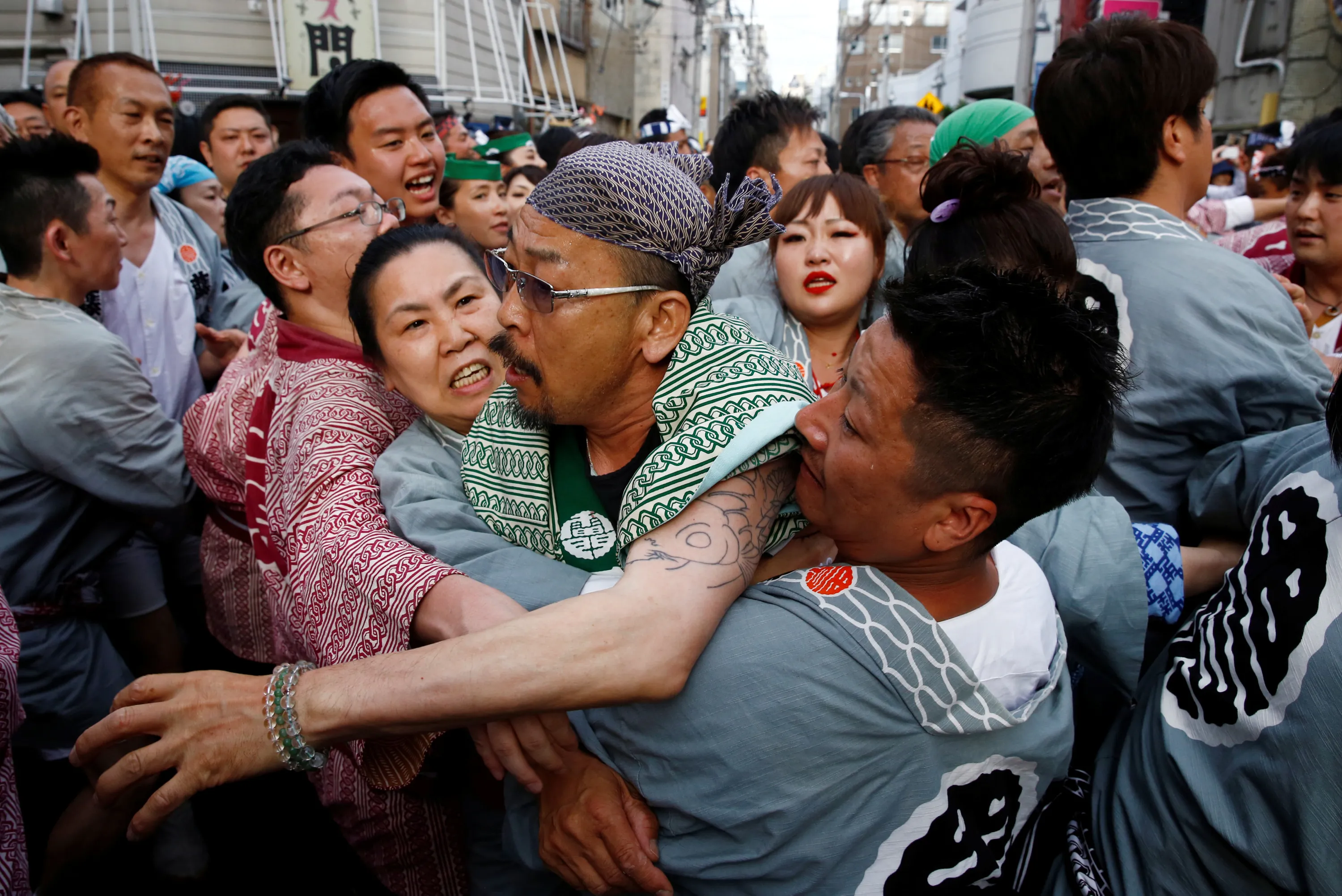 People scuffle to get close to a portable shrine that is being carried by an opposing team during the Sanja festival in Tokyo's Asakusa district, Japan, May 15, 2016. (Photo by Thomas Peter/Reuters)