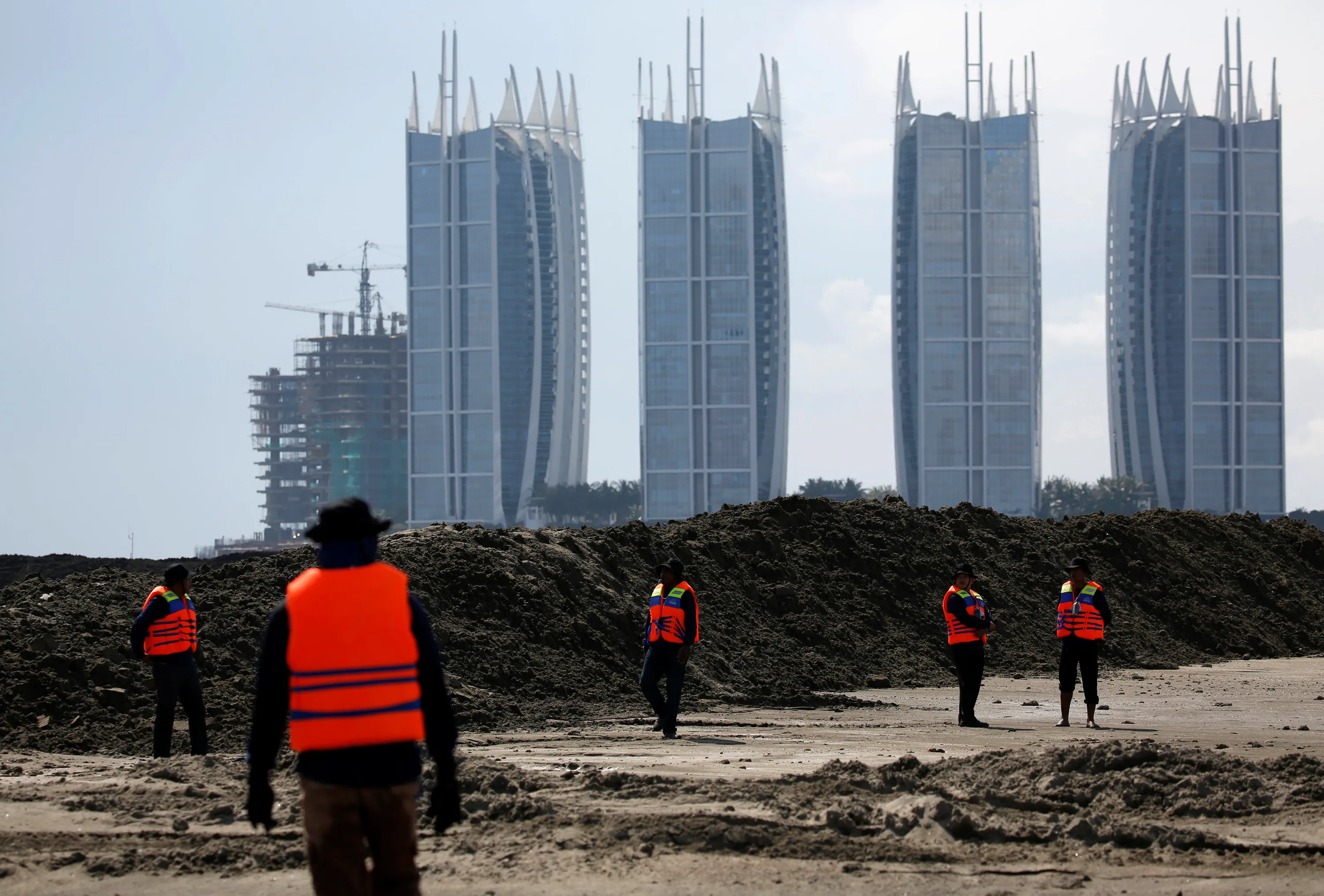 Security guards stand on reclaimed land as fishermen hold a protest against land reclamation in Jakarta Bay, Indonesia, April 17, 2016. (Photo by Reuters/Beawiharta)
