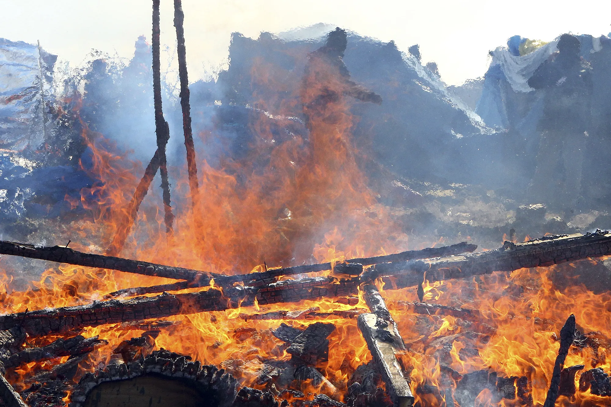 People stand near a burning tent in a makeshift camp near Calais, France, Thursday March 3, 2016. (Photo by Michel Spingler/AP Photo)