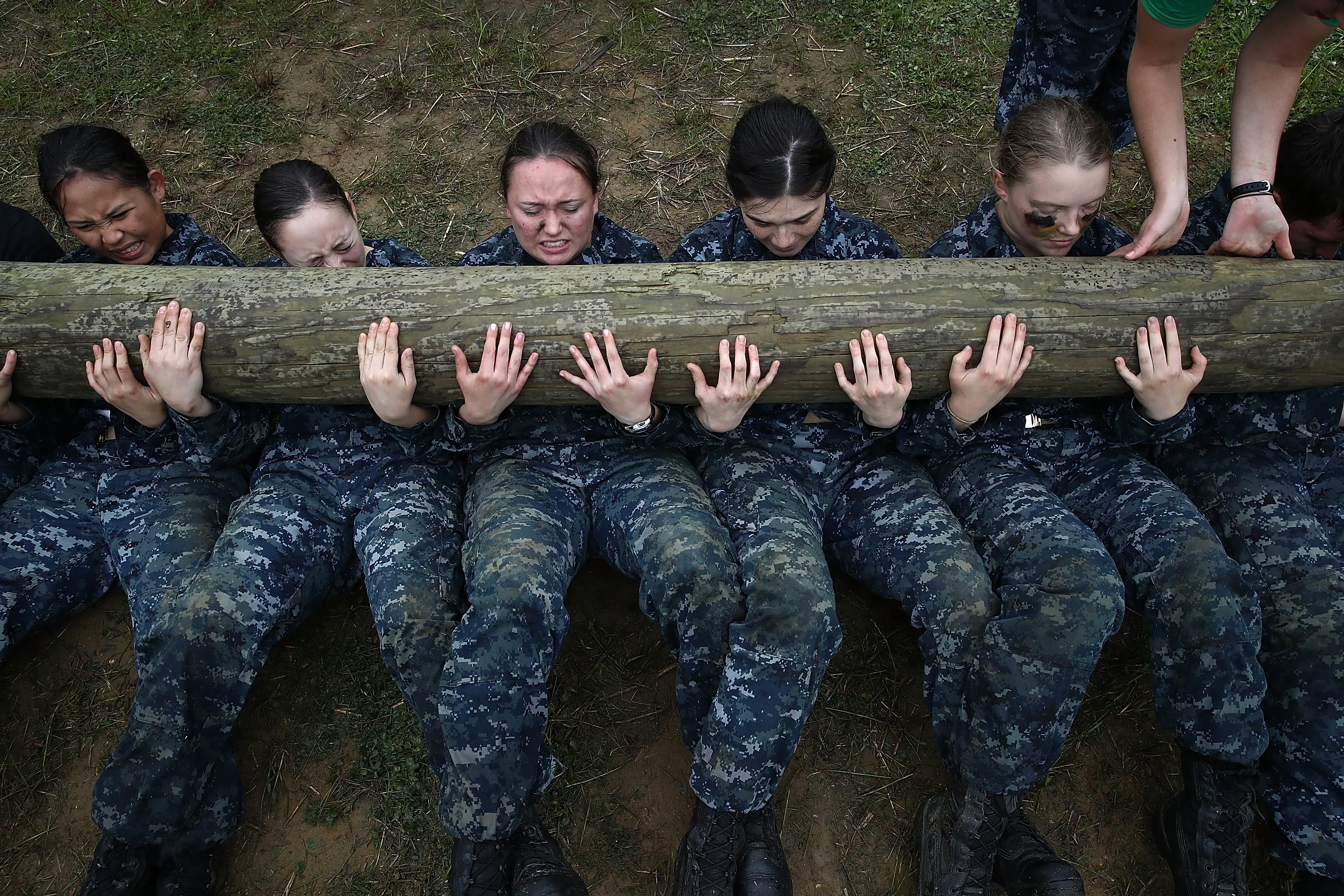 Female Naval Academy plebes perform push ups with a twelve foot log on top of them during the annual Sea Trials May 17, 2016 at the Naval Academy in Annapolis, Maryland. The Naval Academy freshman class endures 14 hours of rigorous physical and mental challenges during the annual Sea Trials training exercise as part of the culmination of their freshman year at the academy. (Photo by Win McNamee/Getty Images)