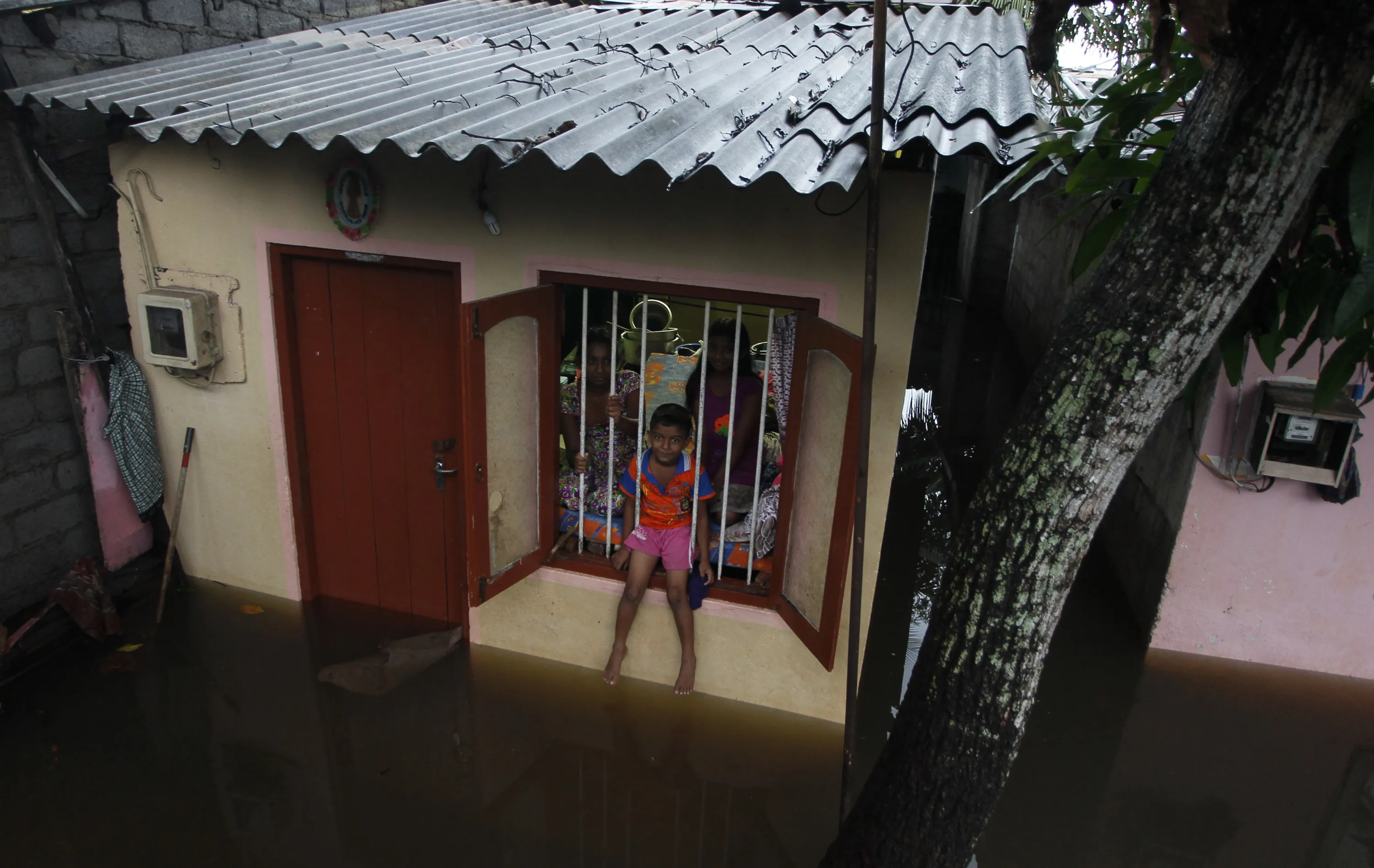 A Sri Lankan boy sits on a window at his house surrounded by flood waters in Colombo, Sri Lanka, Tuesday, May 17, 2016. (Photo by Eranga Jayawardena/AP Photo)