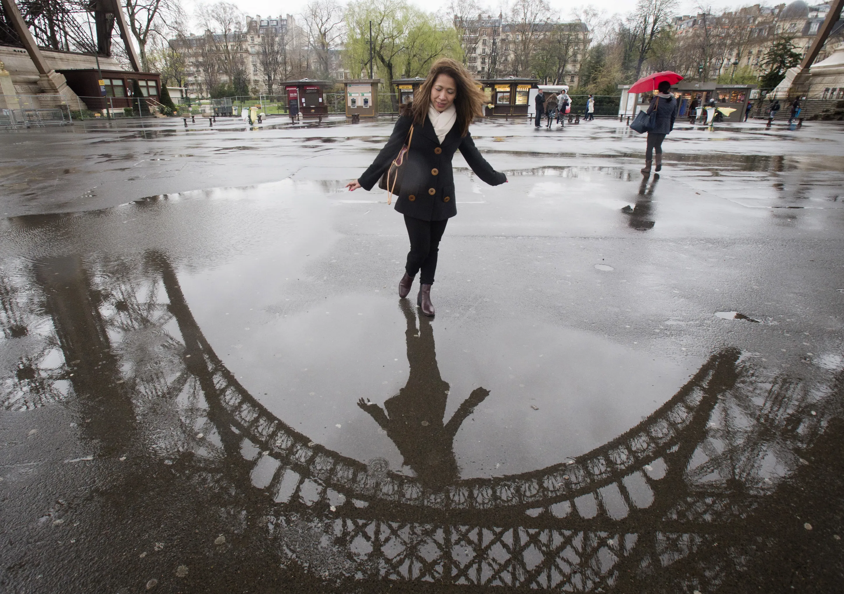 Tourist identified only as Leletskee, from New York, USA, looks at the Eiffel Tower's reflection of the pavement in Paris , Thursday, March 31, 2016. Paris' Eiffel tower is closed all day. The company operating the monument said in a statement there are not enough staff to open the tower with “sufficient security and reception conditions”. (Photo by Jacques Brinon/AP Photo)