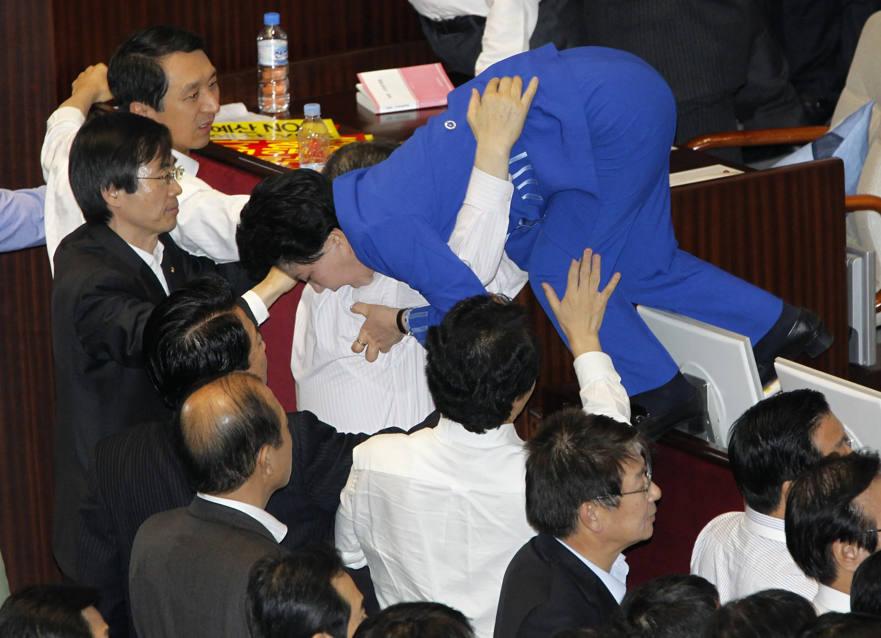 Lawmakers of opposition parties help their fellow lawmaker (top) who tries to escape as they scuffle with lawmakers of the ruling Grand National Party (GNP) at the National Assembly plenary session hall in Seoul, December 8, 2010. (Photo by Jo Yong-Hak/Reuters)