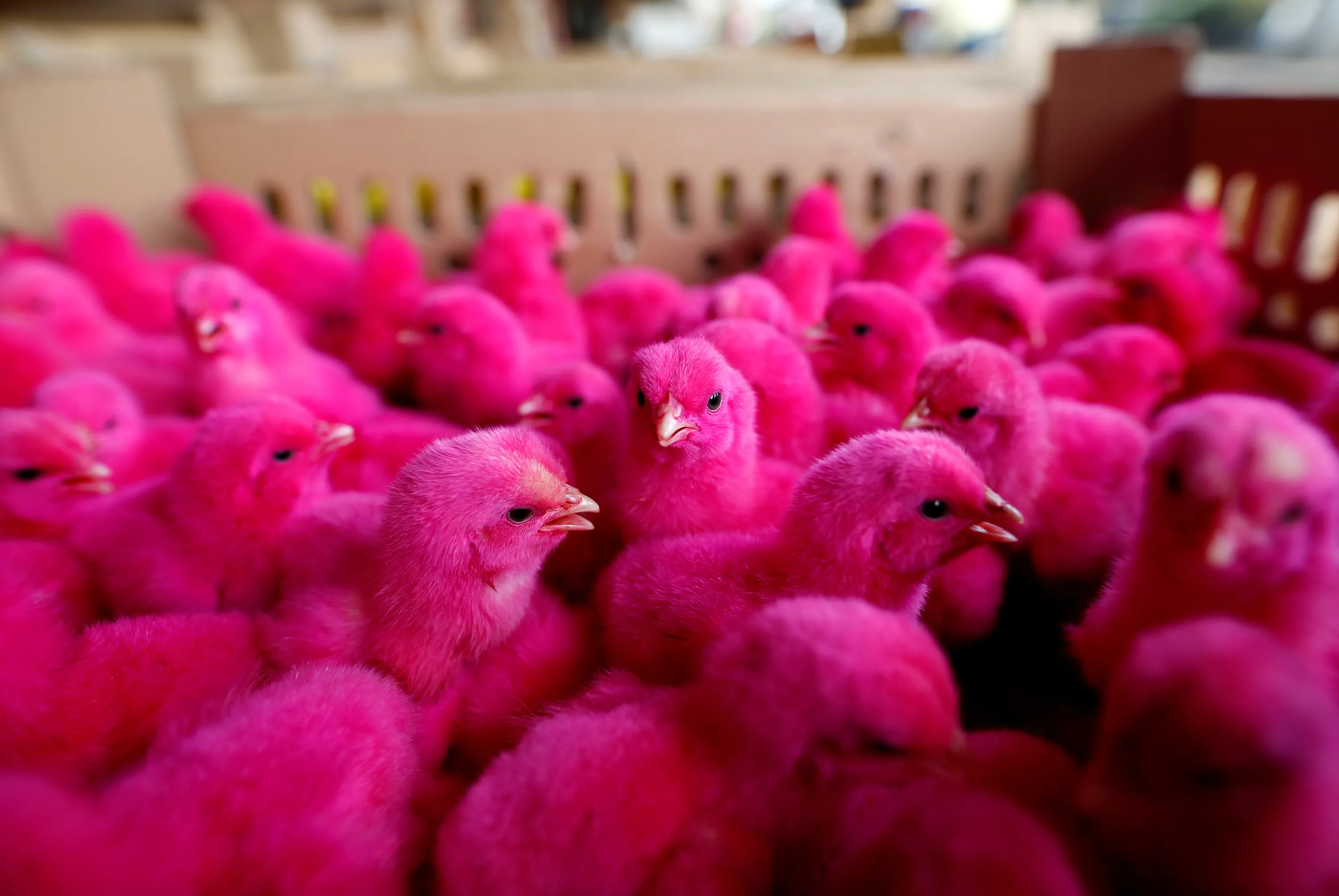 Young chickens dyed to draw attention are offered for sale at a small poultry market in Jakarta, Indonesia May 18, 2016. (Photo by Darren Whiteside/Reuters)