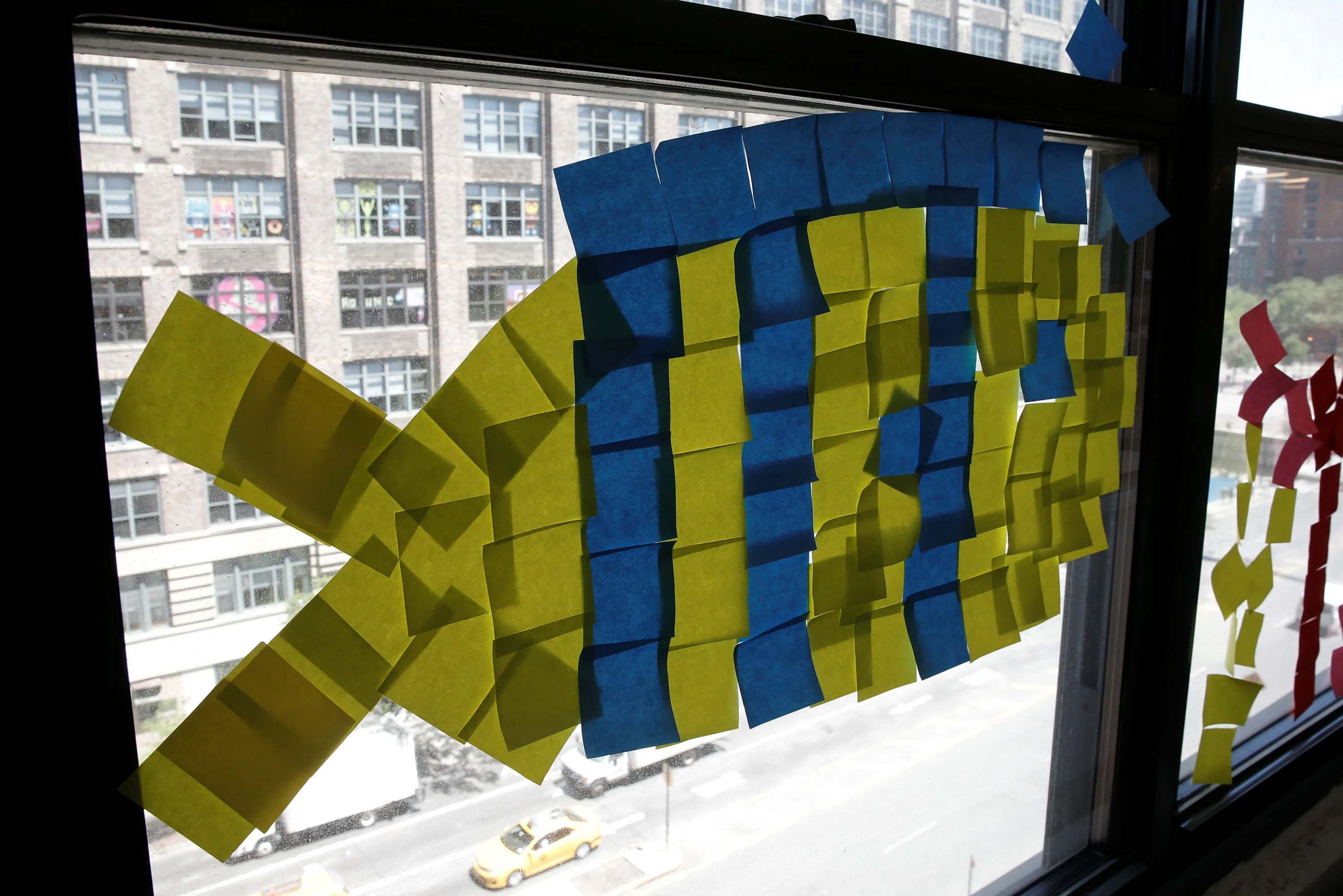 An image of a fish created with Post-it notes is seen in windows at 200 Hudson street in lower Manhattan, New York, U.S., May 18, 2016. (Photo by Mike Segar/Reuters)