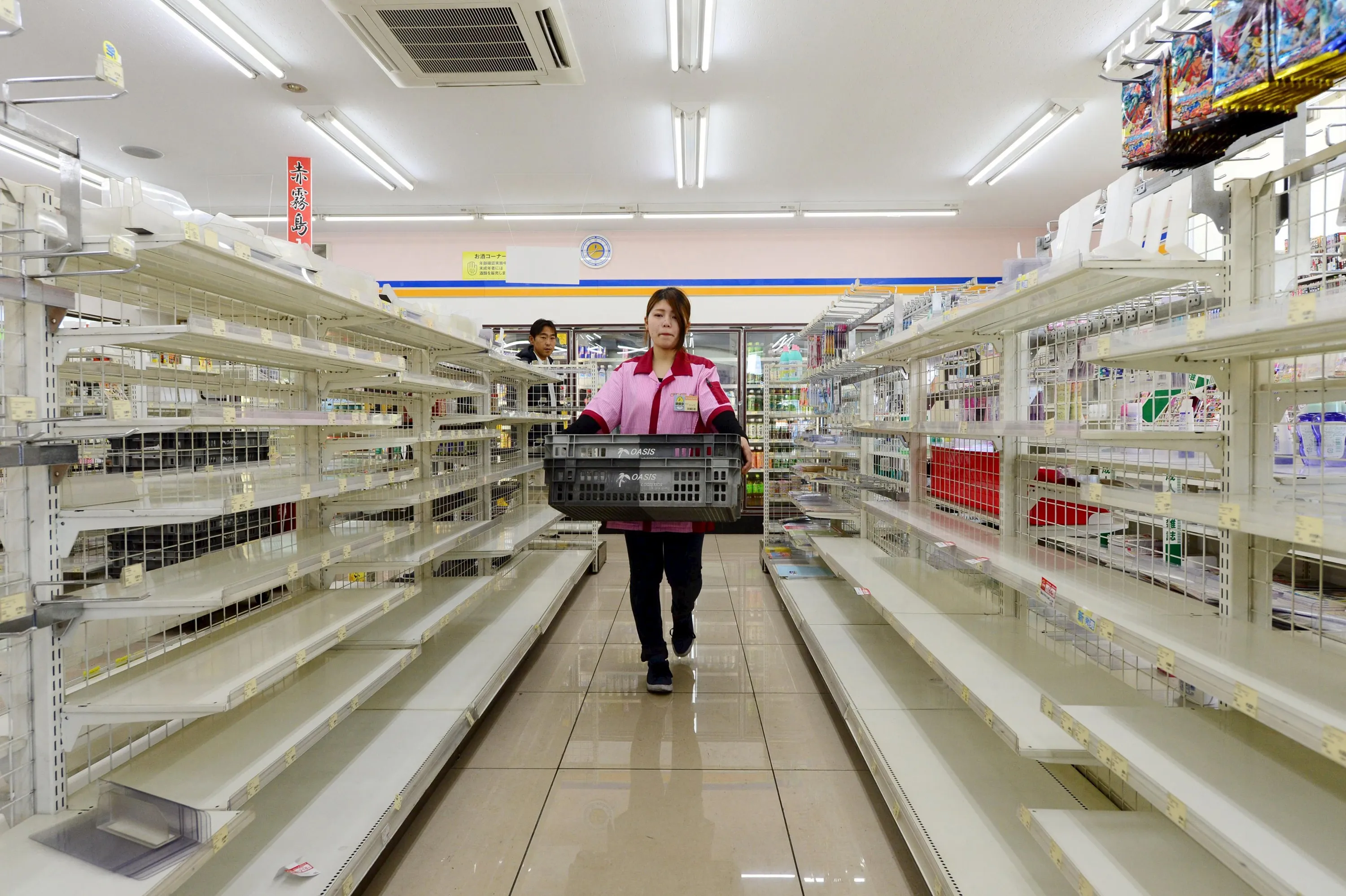Empty shelves for displaying food are seen after items sold out at a store following a series of earthquakes in Kumamoto, Japan, in this photo taken by Kyodo April 20, 2016. (Photo by Reuters/Kyodo News)