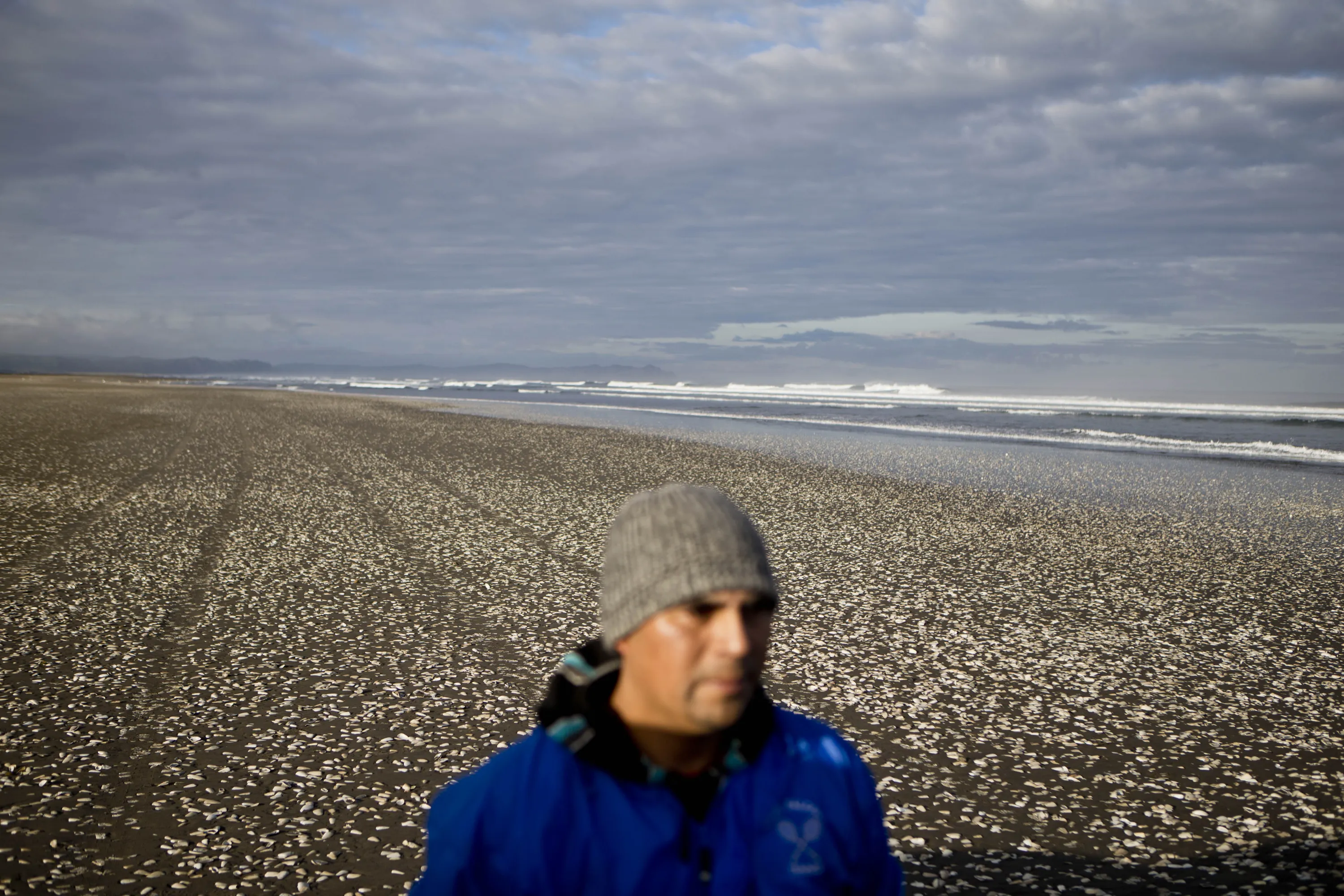 Fisherman Freddy Guenuman stands on a beach covered with shells in Cucao, on Chiloe Island, Chile, Monday, May 9, 2016. (Photo by Esteban Felix/AP Photo)