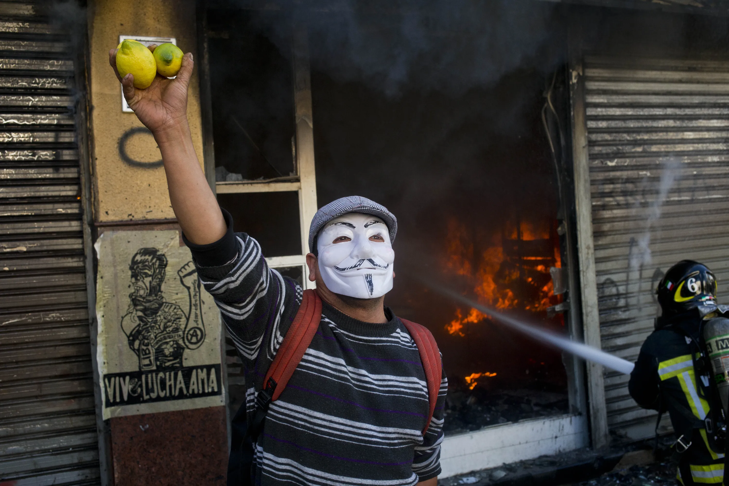 A man wearing a Guy Fawkes mask hawks lemons as a fireman works to put out a fire during an anti-government protest that turned violent, near a Congress where Chile's President Michelle Bachelet gives her annual address, in Valparaiso, Chile, Saturday, May 21, 2016. (Photo by Esteban Felix/AP Photo)