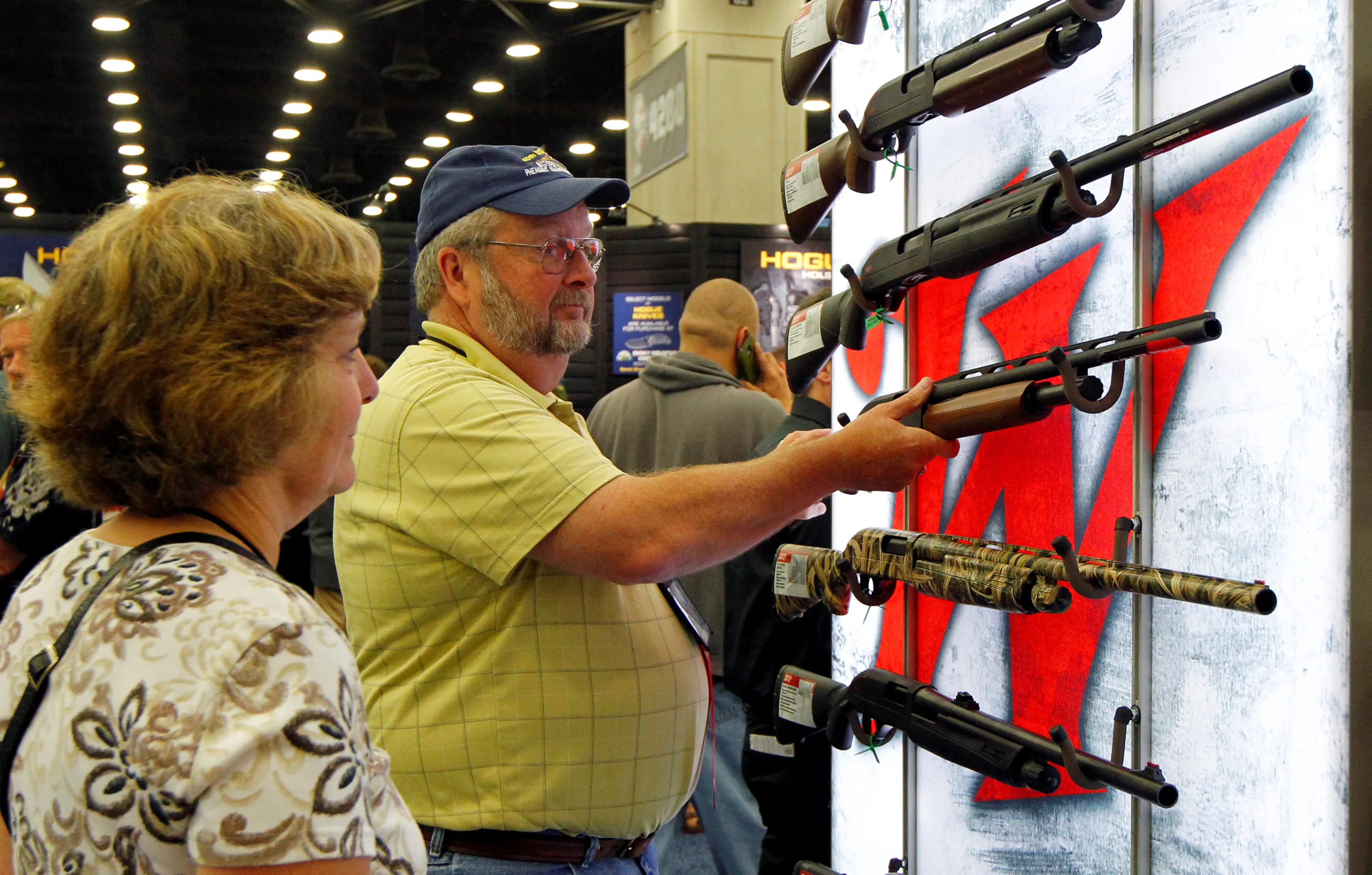 Gun enthusiasts look over Winchester guns at the National Rifle Association's annual meetings & exhibits show in Louisville, Kentucky, May 21, 2016. (Photo by John Sommers II/Reuters)
