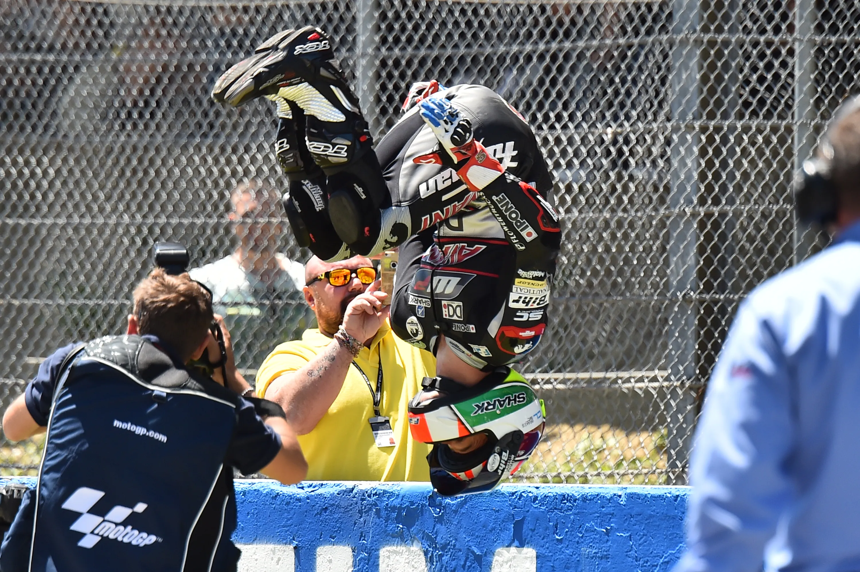 Moto2 rider Johann Zarco (Kalex), jumps to celebrate after winning the Moto2 race as part of the Italian Moto Grand Prix at the racetrack in Mugello on May 22, 2016. (Photo by Giuseppe Cacace/AFP Photo)