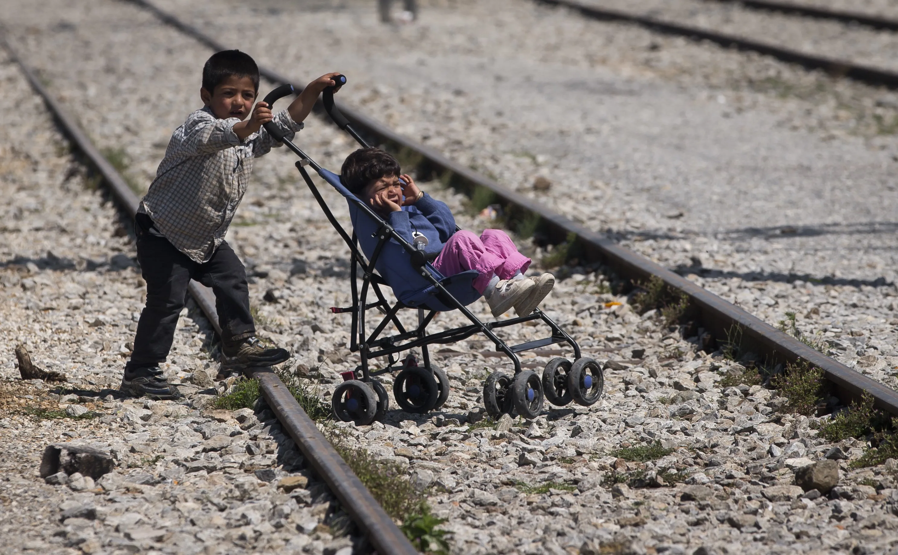 A boy pushes a stroller with a child at the migrants camp in Idomeni, Greece, Sunday, May 22, 2016. Thousands of stranded refugees and migrants have camped in Idomeni for months after the border was closed. (Photo by Darko Bandic/AP Photo)
