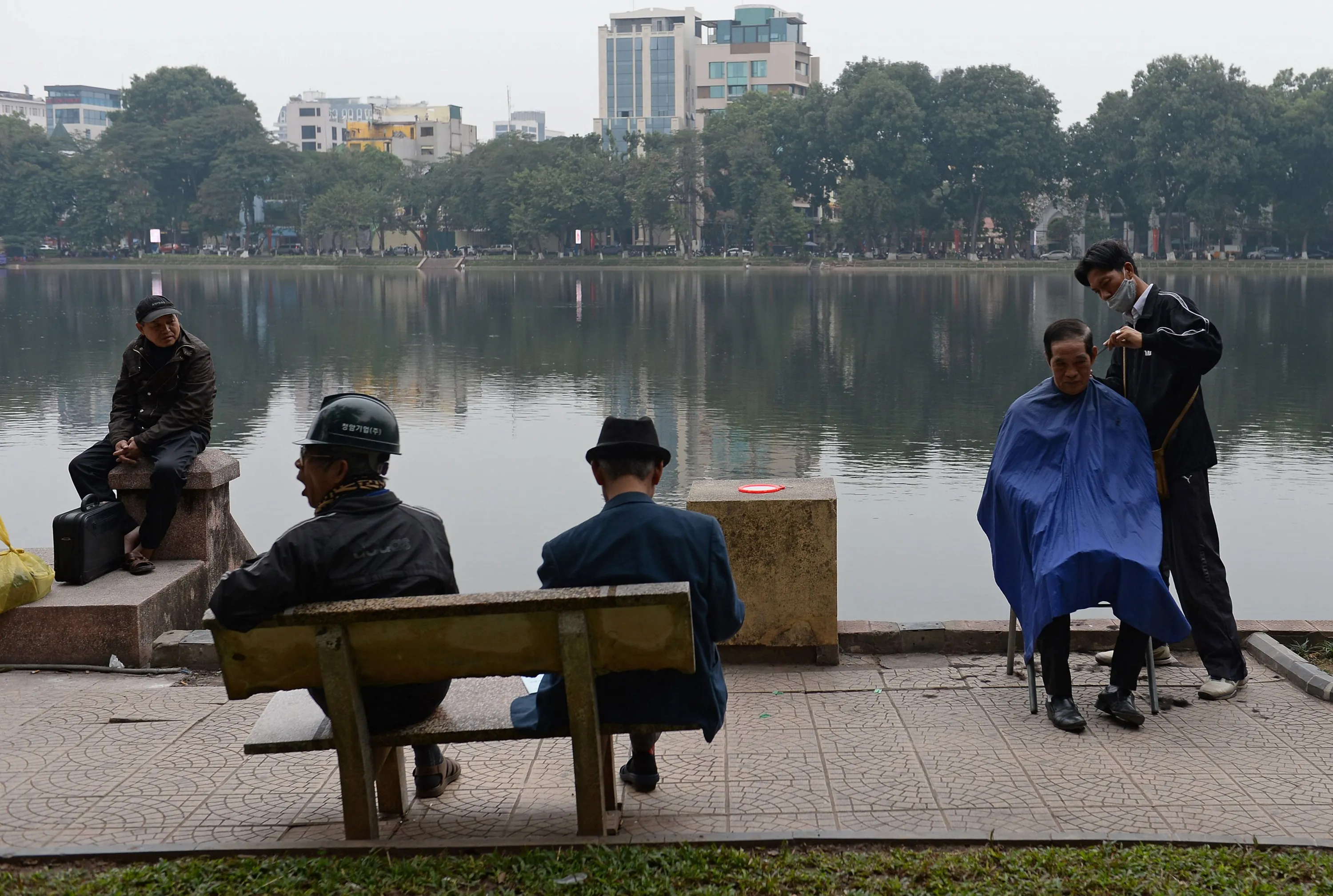 This picture taken on January 18, 2016 shows a street barber (R) serving a customer at a public park in downtown Hanoi. From Soviet-style letters of denunciation to outlandish rumours of a coup, Hanoi is abuzz with political gossip ahead of a key leadership change this week that has plunged the ruling communist elite into turmoil. (Photo by Hoang Dinh Nam/AFP Photo)