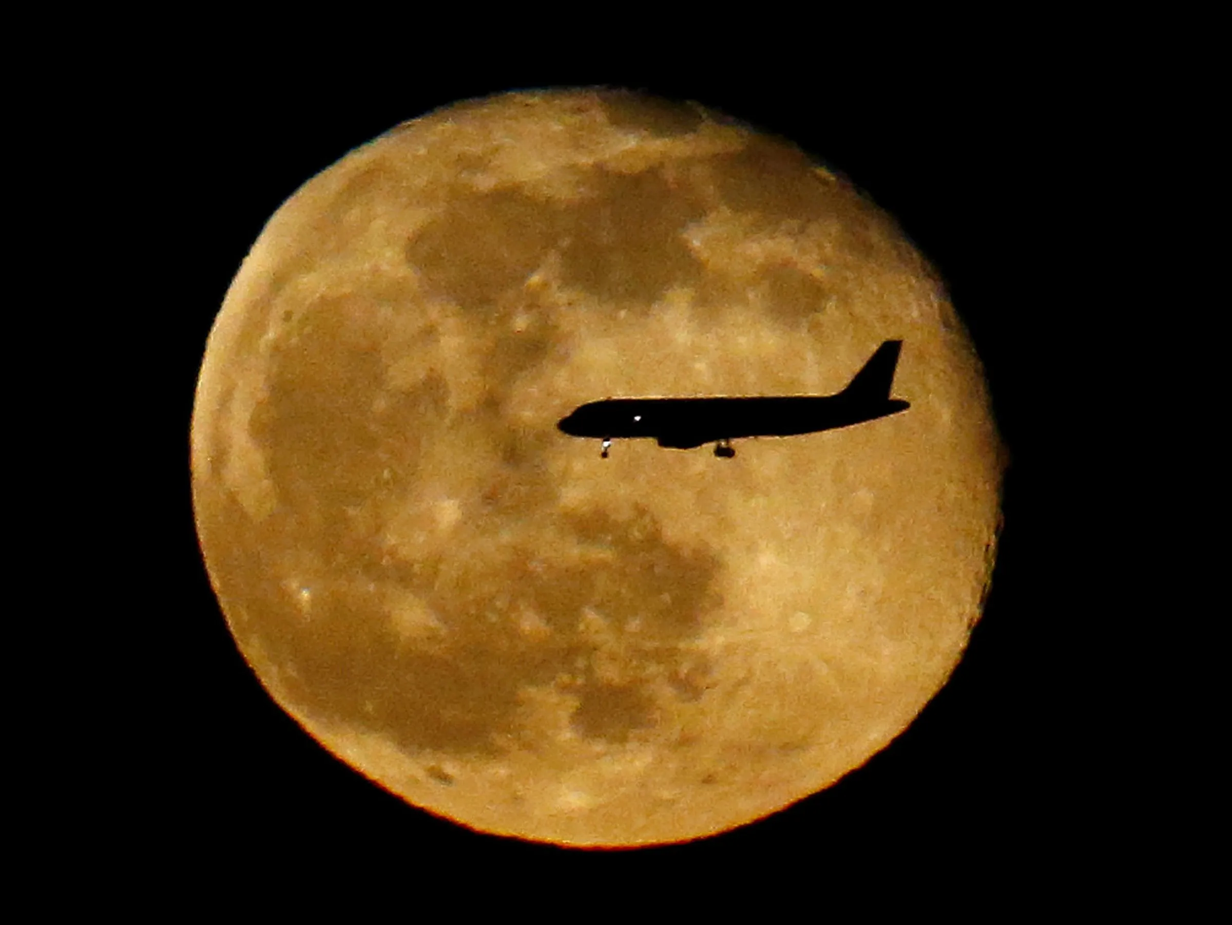 A plane descending onto New York City's La Guardia Airport crosses in front of the moon rising in its waning gibbous stage seen from The Heights neighborhood of Jersey City, N.J., Saturday, April 23, 2016. (Photo by Julio Cortez/AP Photo)