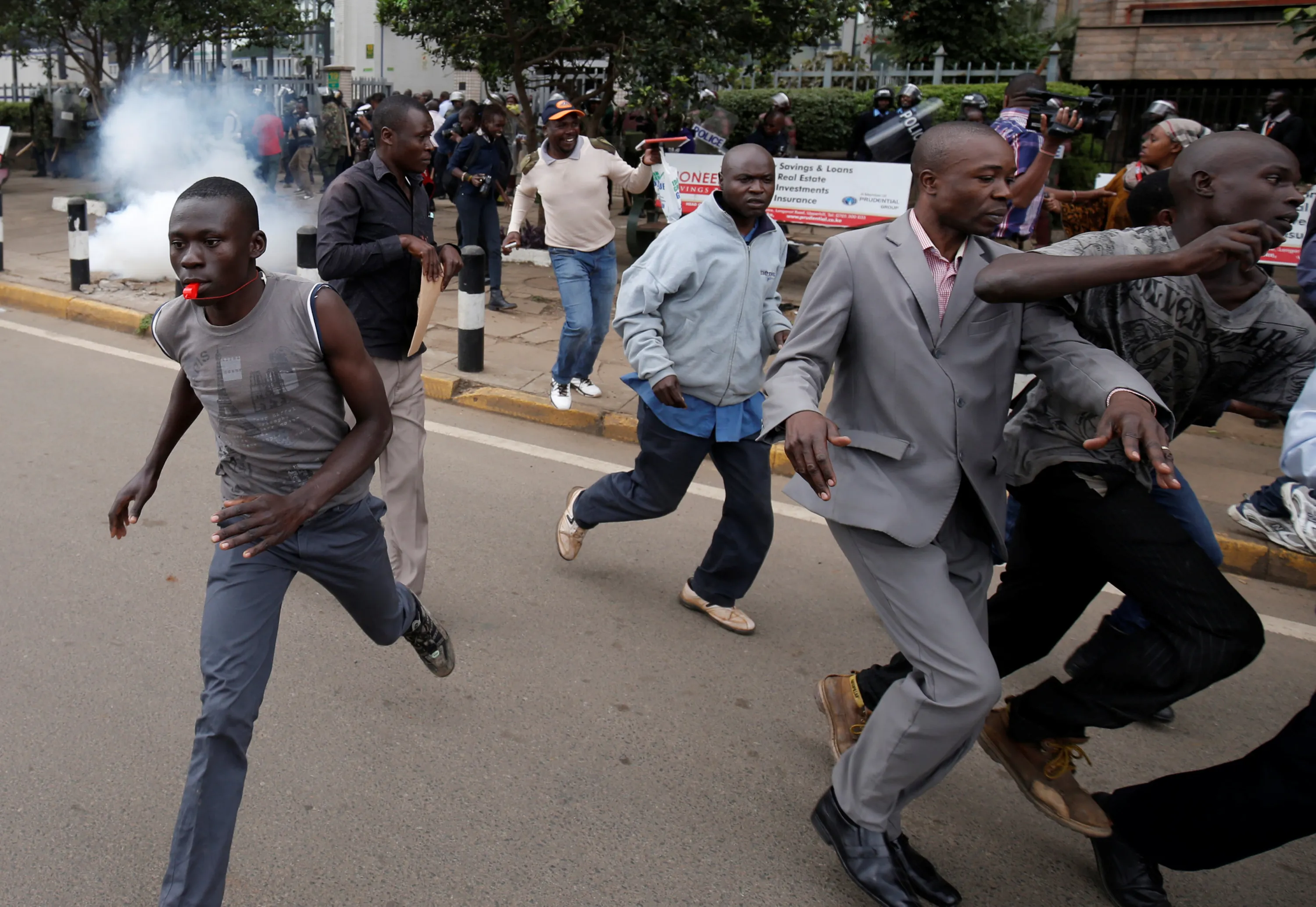 Supporters of Kenya's opposition Coalition for Reforms and Democracy (CORD) run away after riot police lobbed teargas canisters to disperse them during a protest at the premises hosting the headquarters of Independent Electoral and Boundaries Commission (IEBC) to demand the disbandment of the electoral body ahead of next year's election in Nairobi, Kenya, May 23, 2016. (Photo by Goran Tomasevic/Reuters)