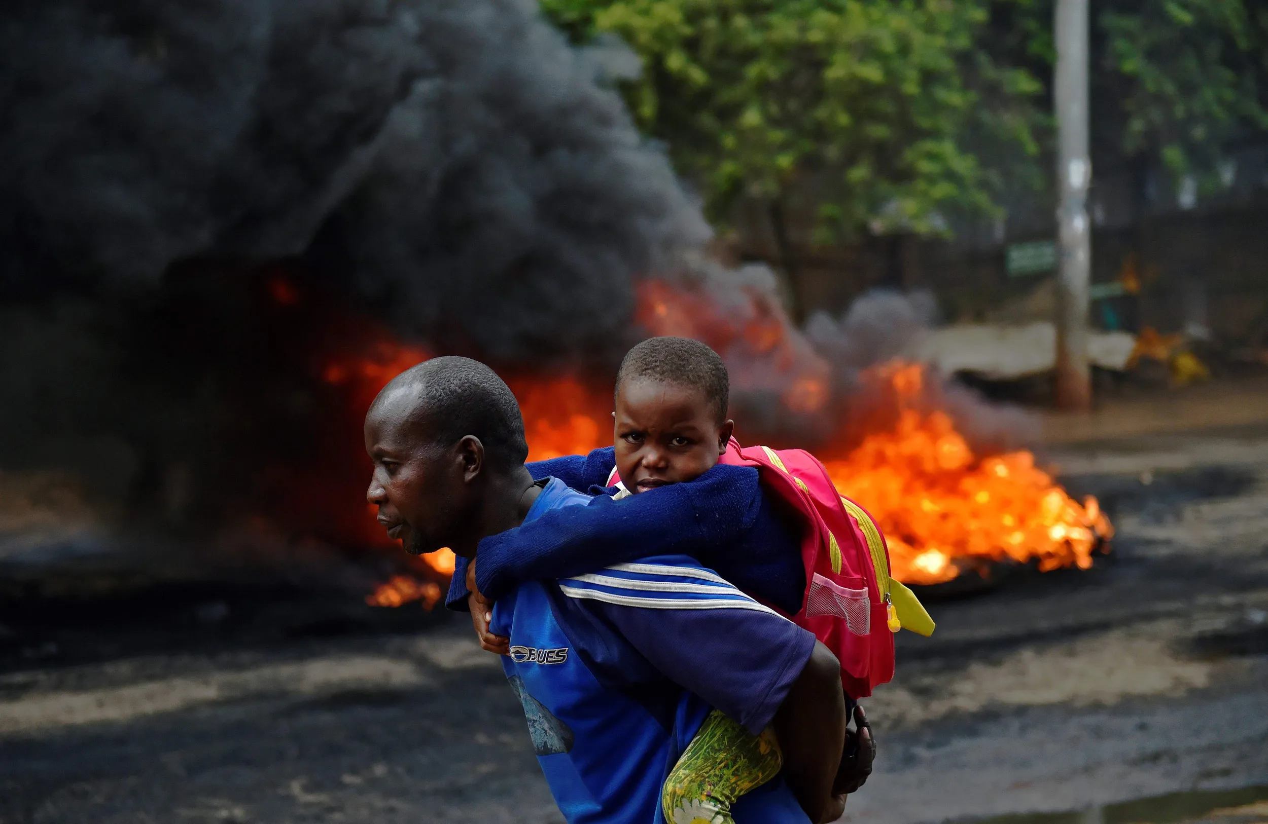 A a man carries a school pupil away from teargas and a burning barricade in Kibera slum, during a demonstration of opposition supporters protesting for a change of leadership ahead of a vote due next years on May 23, 2016 in Nairobi. (Photo by Carl De Souza/AFP Photo)