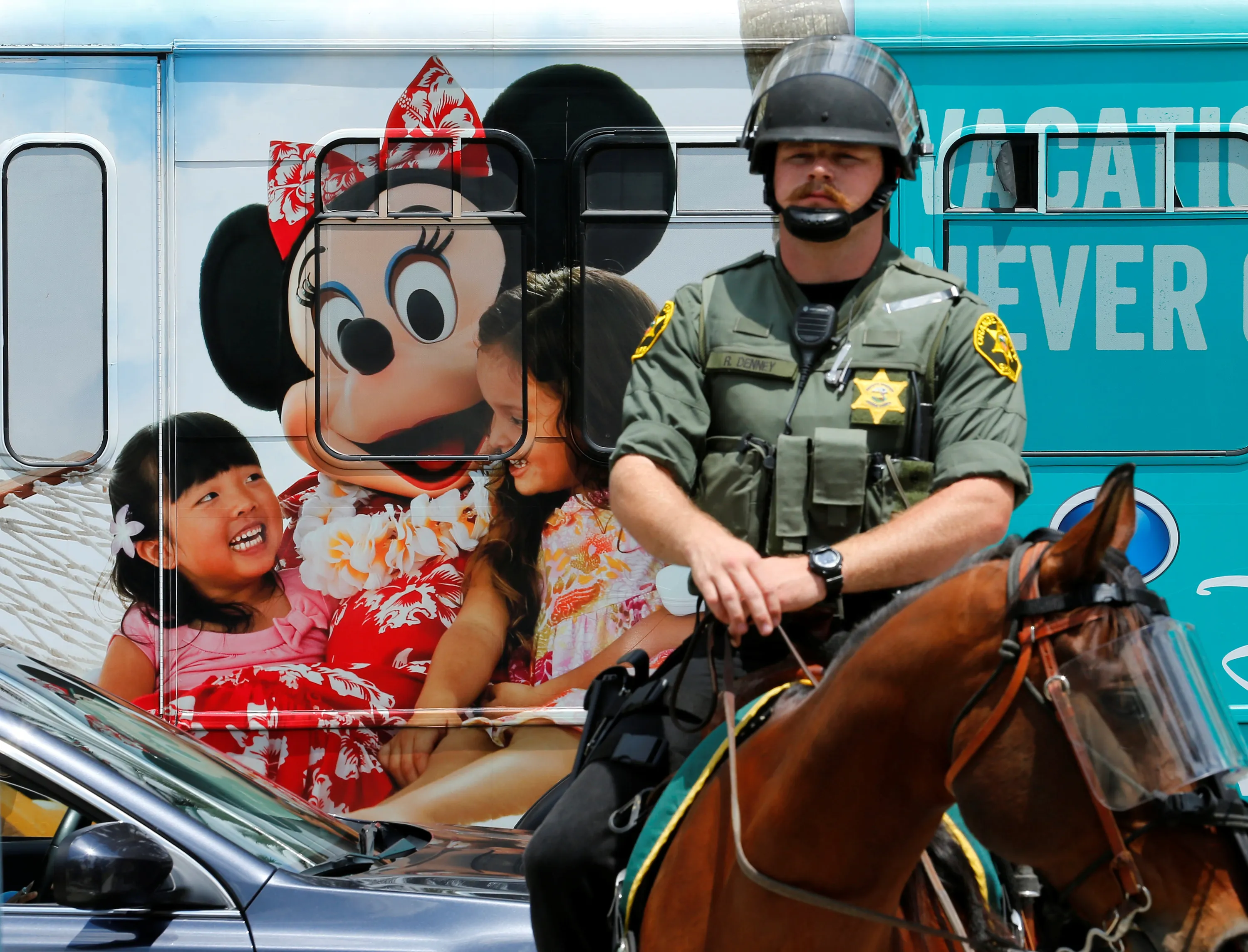 A member of the Orange County Sheriff watches demonstrators before U.S. Republican presidential candidate Donald Trump speaks at a campaign event in Anaheim, California, U.S., May 25, 2016. (Photo by Mike Blake/Reuters)