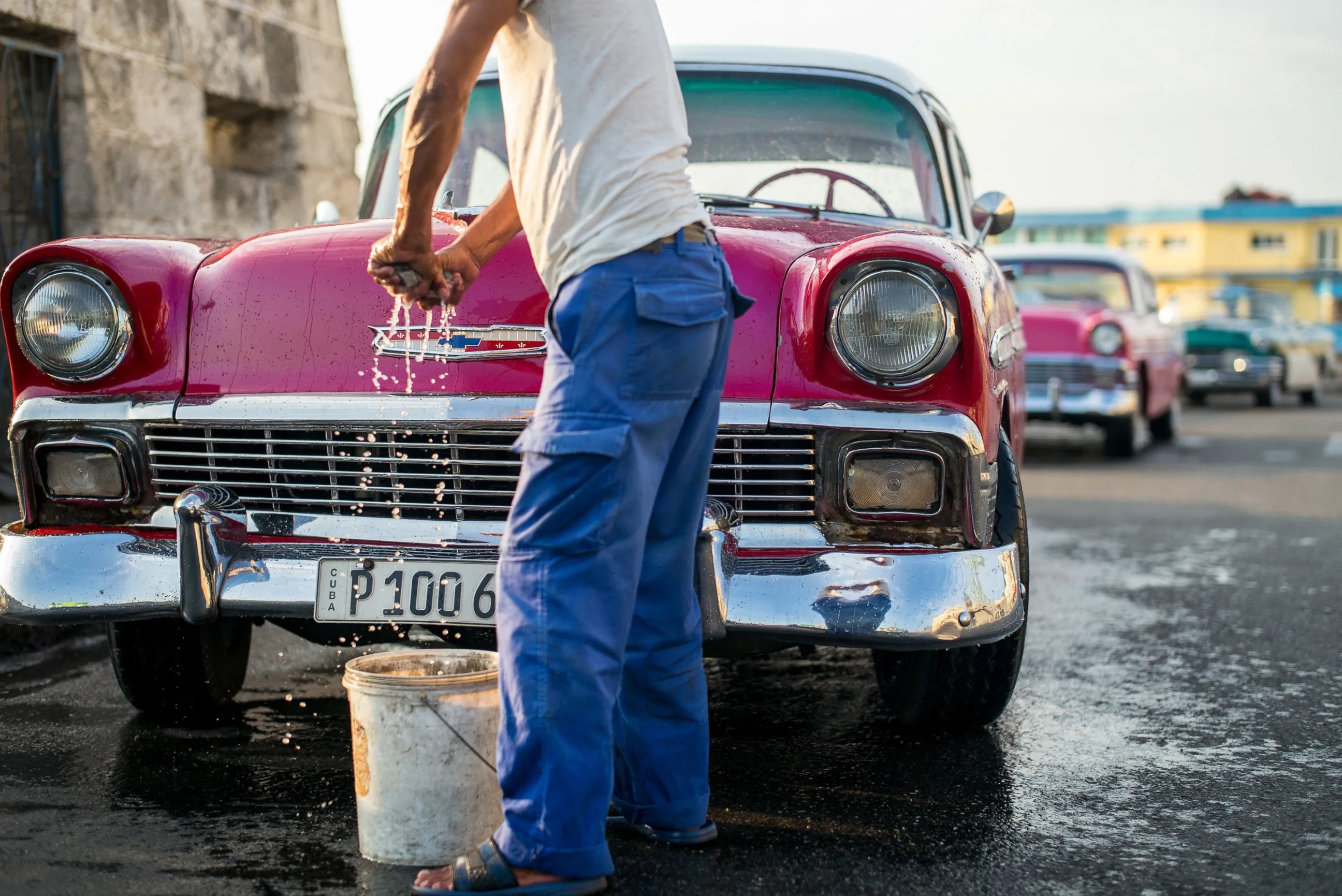 A man washes a series of 1950s Chevy taxis parked in the old port of Old Havana in the early morning of May 2, 2016. A few hours later, the first American cruise ship in decades entered the port. (Photo by Dotan Saguy)