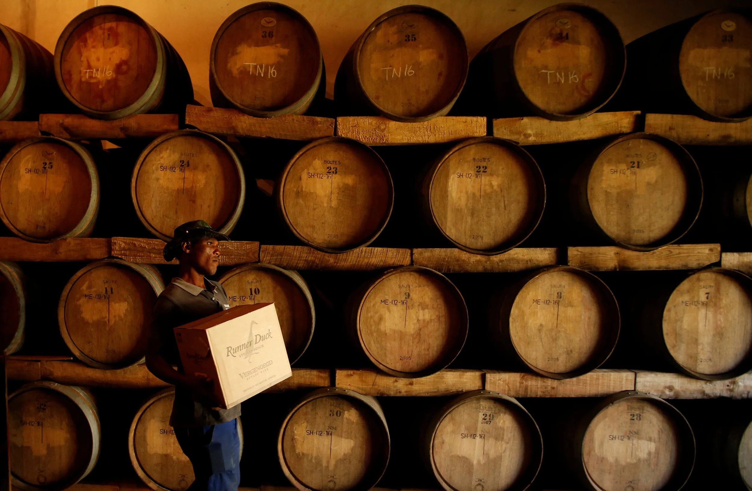 A farmworker carries a box of Runner Duck wine past barrels at the Vergenoegd wine estate near Cape Town, South Africa, May 20, 2016. (Photo by Mike Hutchings/Reuters)